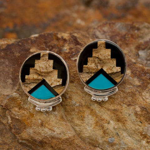 These gorgeous Sterling Silver Earrings, as part of the Turquoise Creek collection, feature Black Jade, Picture Jasper, and Kingman Turquoise.
