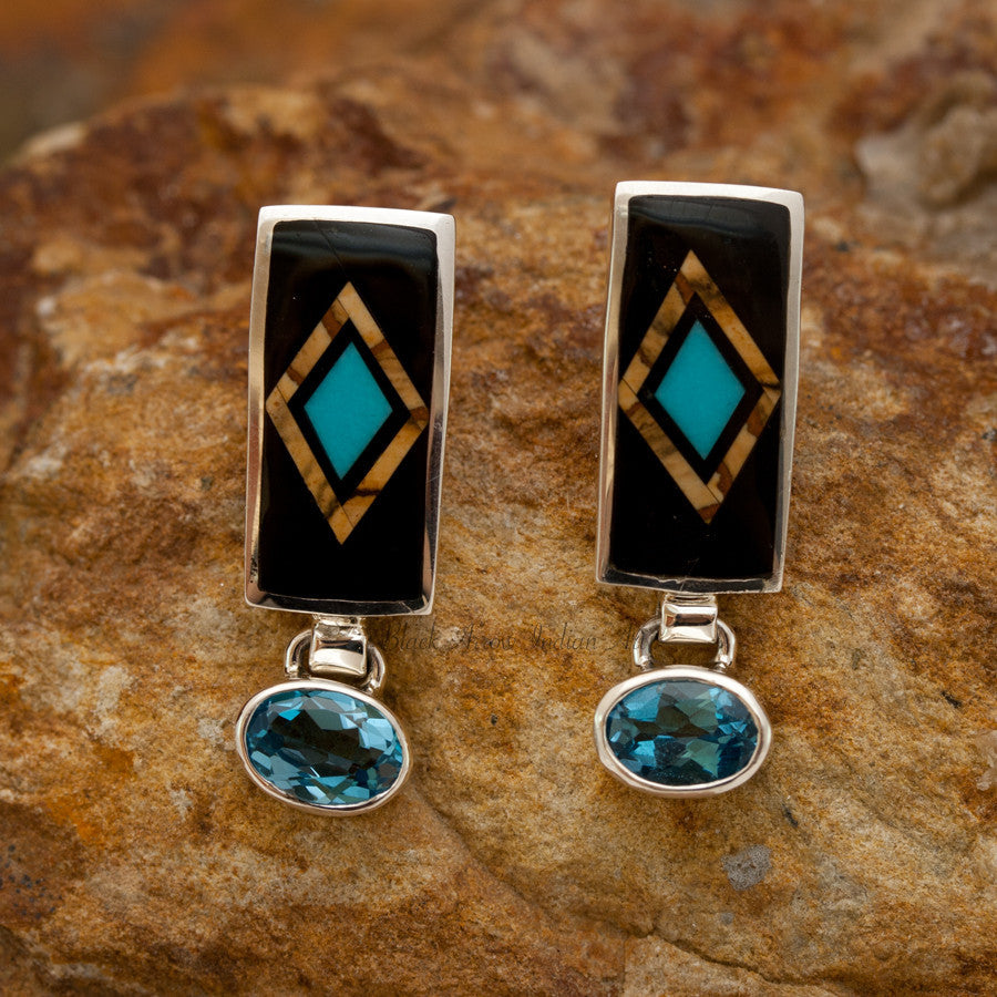 David Rosales Turquoise Creek Inlaid Sterling Silver Earrings w Blue Topaz