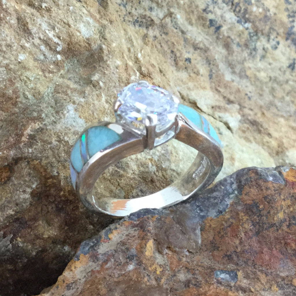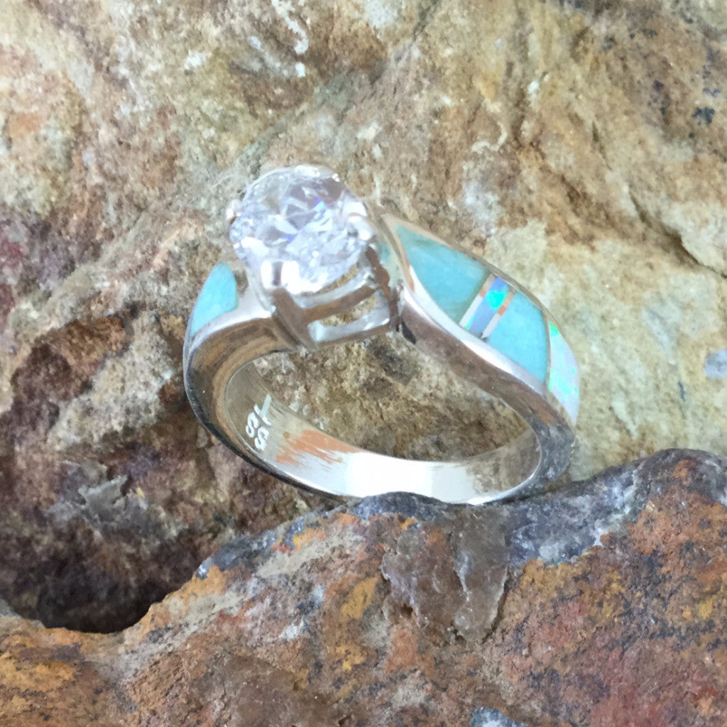 This beautiful Sterling Silver Ring, as part of the Amazing Light Collection, features Amazonite and Lab Opal with a brilliant Cubic Zirconia.