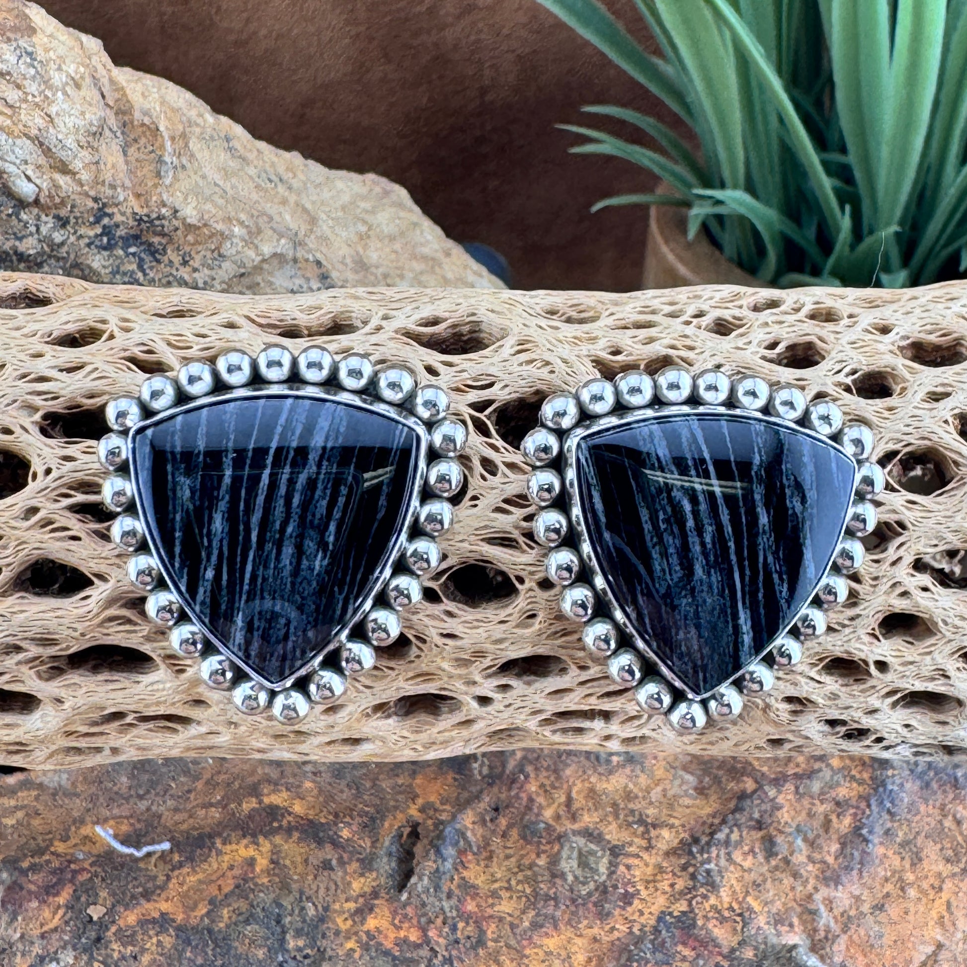 These striking post earrings feature shield-shaped Zebra Jasper stones, known for their rich black base laced with fine grey veining. Set in sterling silver, each stone is framed by a bold border of hand-placed silver spheres that add texture and visual depth. A perfect blend of earthy strength and contemporary elegance, these earrings are ideal for adding a touch of the Southwest to any look.