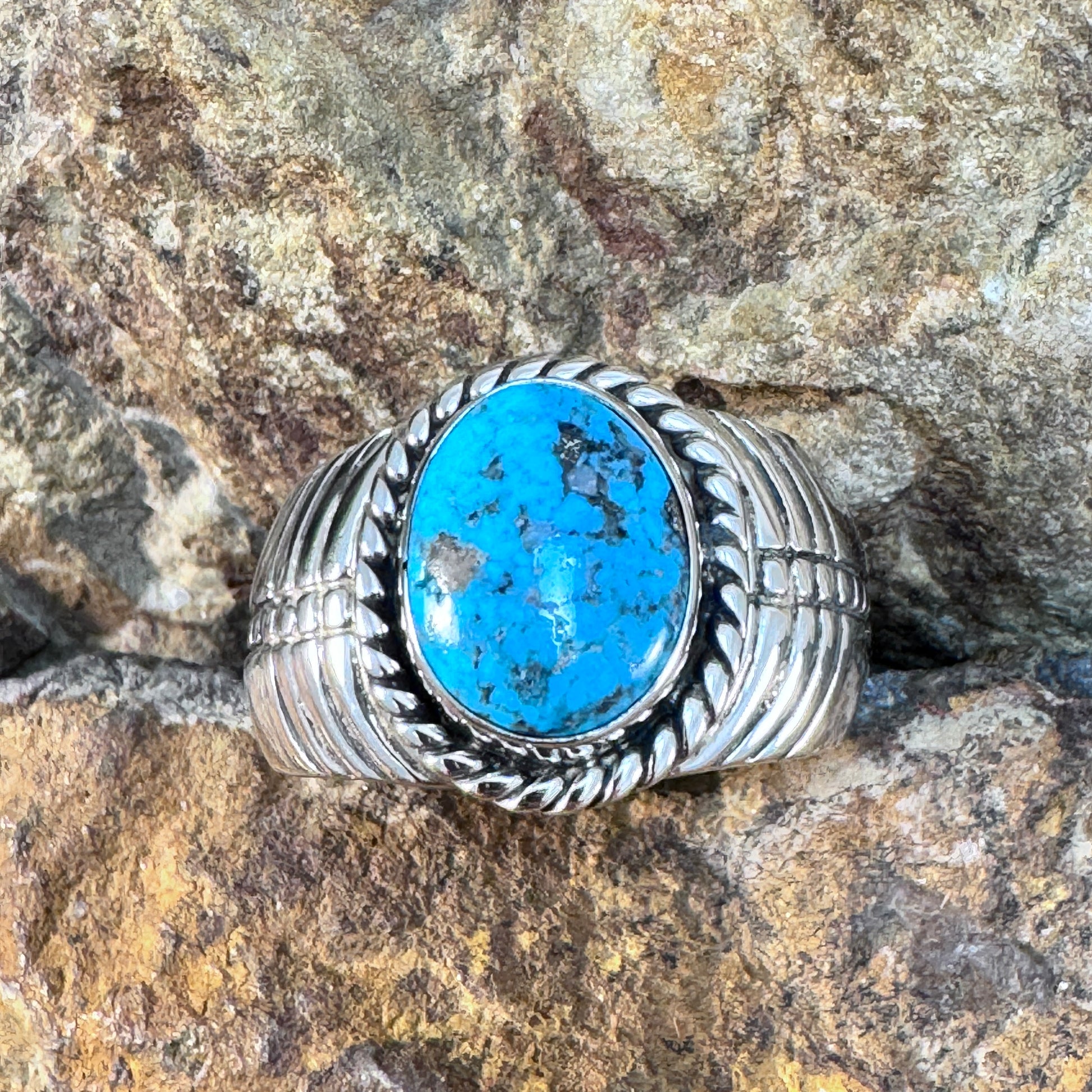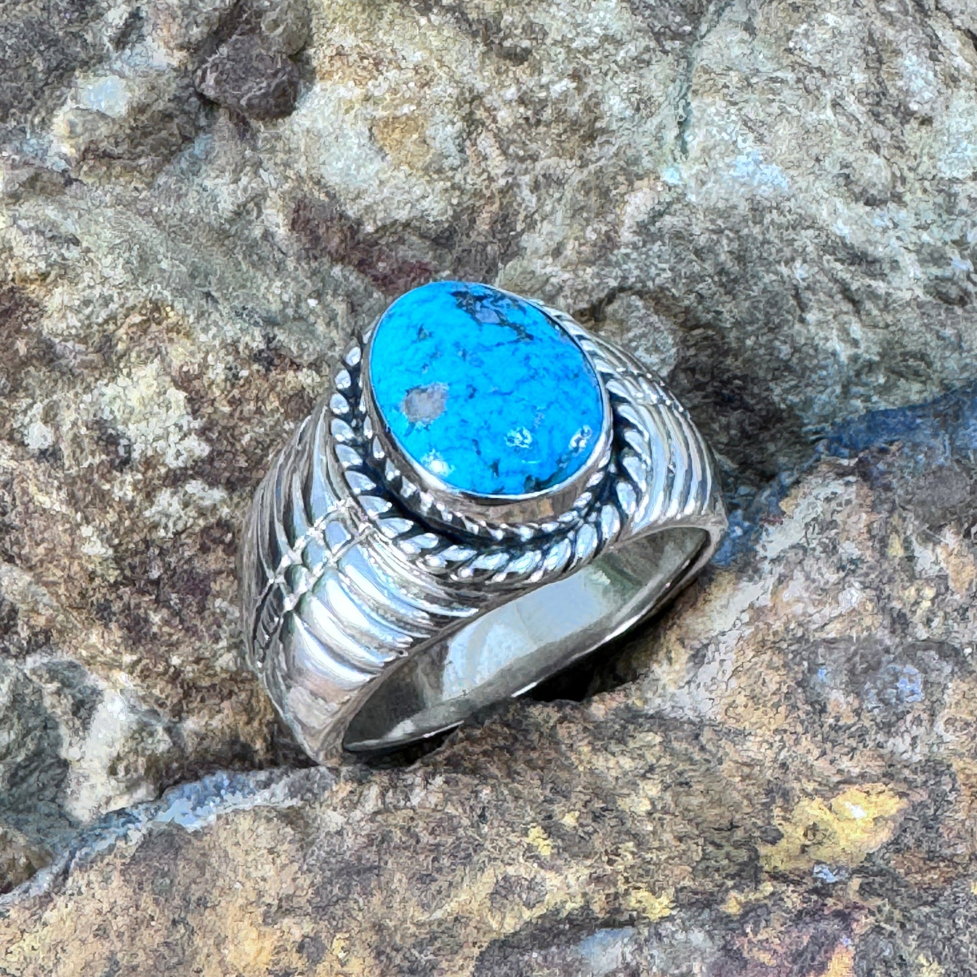 This bold sterling silver ring features a vibrant Kingman turquoise cabochon, rich in sky-blue tones with natural dark matrix. The oval stone is bezel-set and framed by a twisted rope border, adding classic Navajo character. The wide, tapered shank is accented with vertical stamp work and deeply grooved lines, giving the ring a strong, masculine silhouette. A perfect everyday statement piece or a meaningful gift.