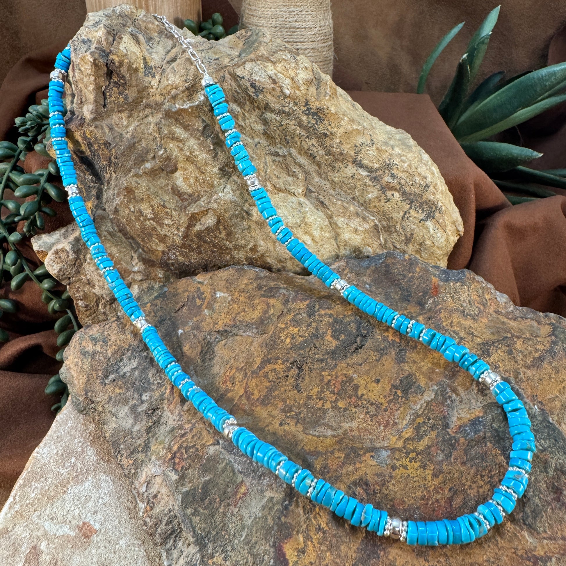 This necklace showcases bright sky-blue Kingman turquoise heishi beads accented with sterling silver beads. Hand-strung by Doris Coriz, each turquoise disc measures 4–5mm in diameter, and the necklace is 20" long.