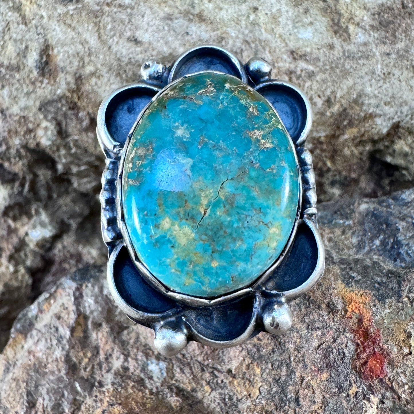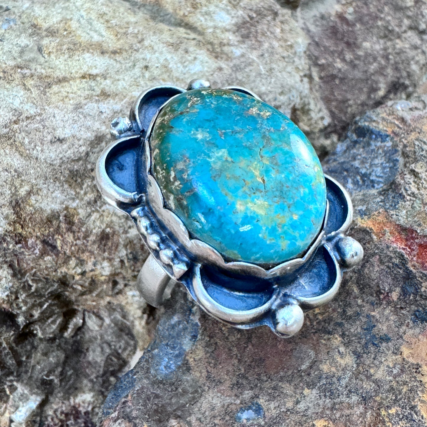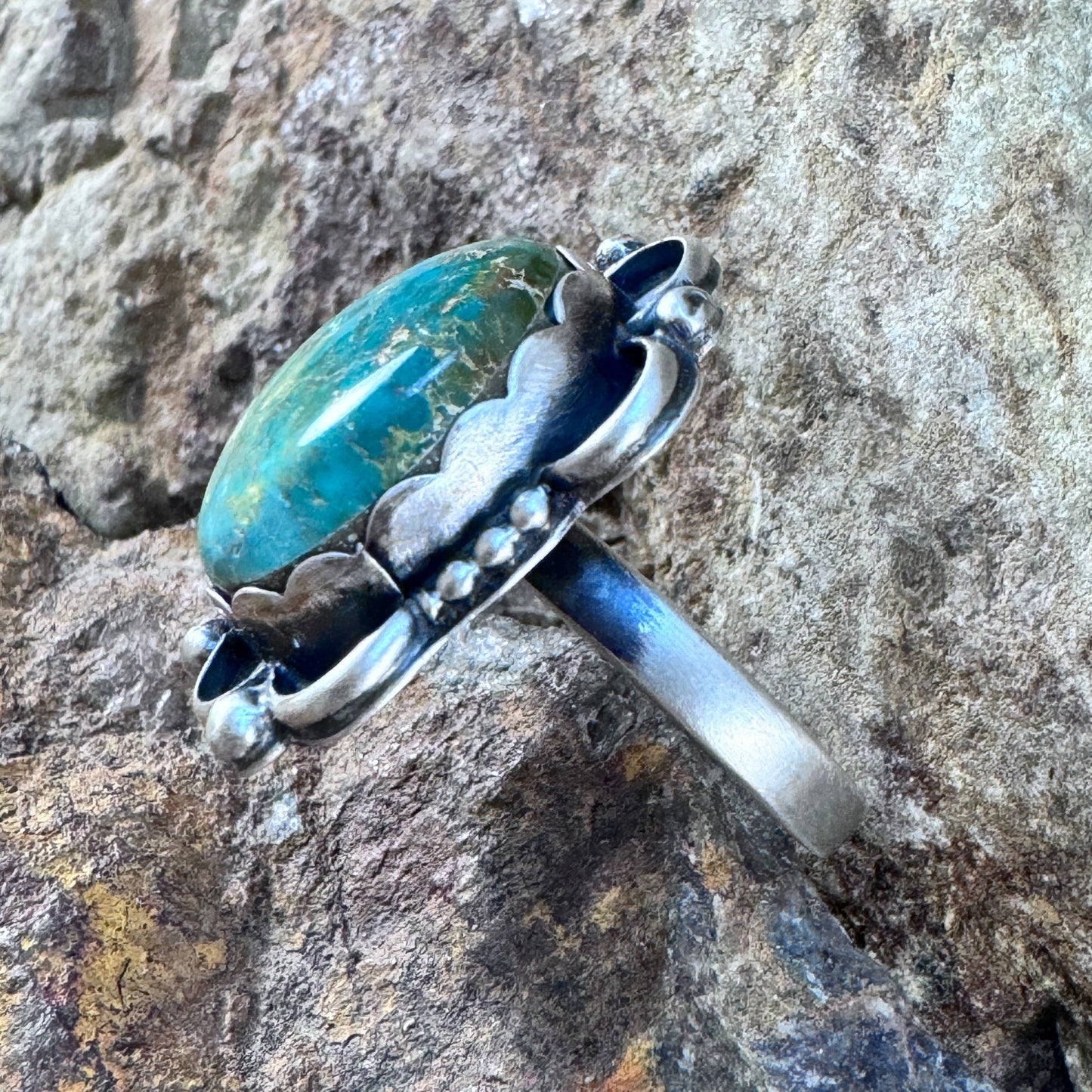 This Navajo-crafted ring showcases a rich blue-green turquoise stone with natural earthy matrixing, from the Royston mine. The stone is set in a scalloped sterling silver bezel with oxidized detailing, giving it a unique, vintage appearance. The silverwork around the stone is enhanced with classic Navajo bead accents, creating a timeless and traditional design perfect for any collection.