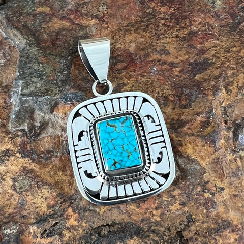 This beautiful, highly detailed Sterling Silver Pendant features Kingman Turquoise with Web Matrix. Handcrafted by Native American artists. Colors may vary due to computer monitor.