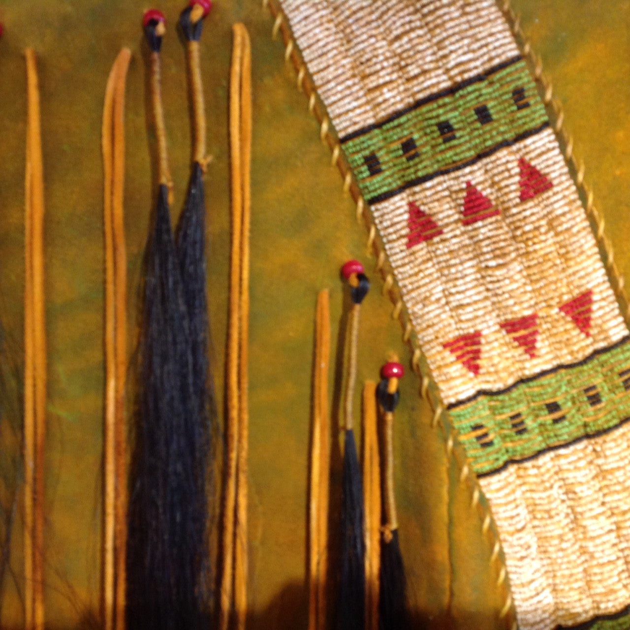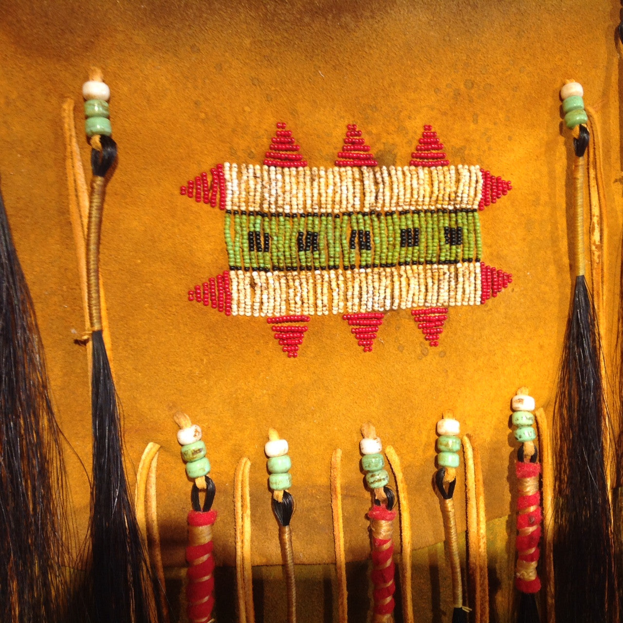 Materials: Deer hide, seed beads, crow beads, red trade cloth, horsehair, green and red trade pigments.