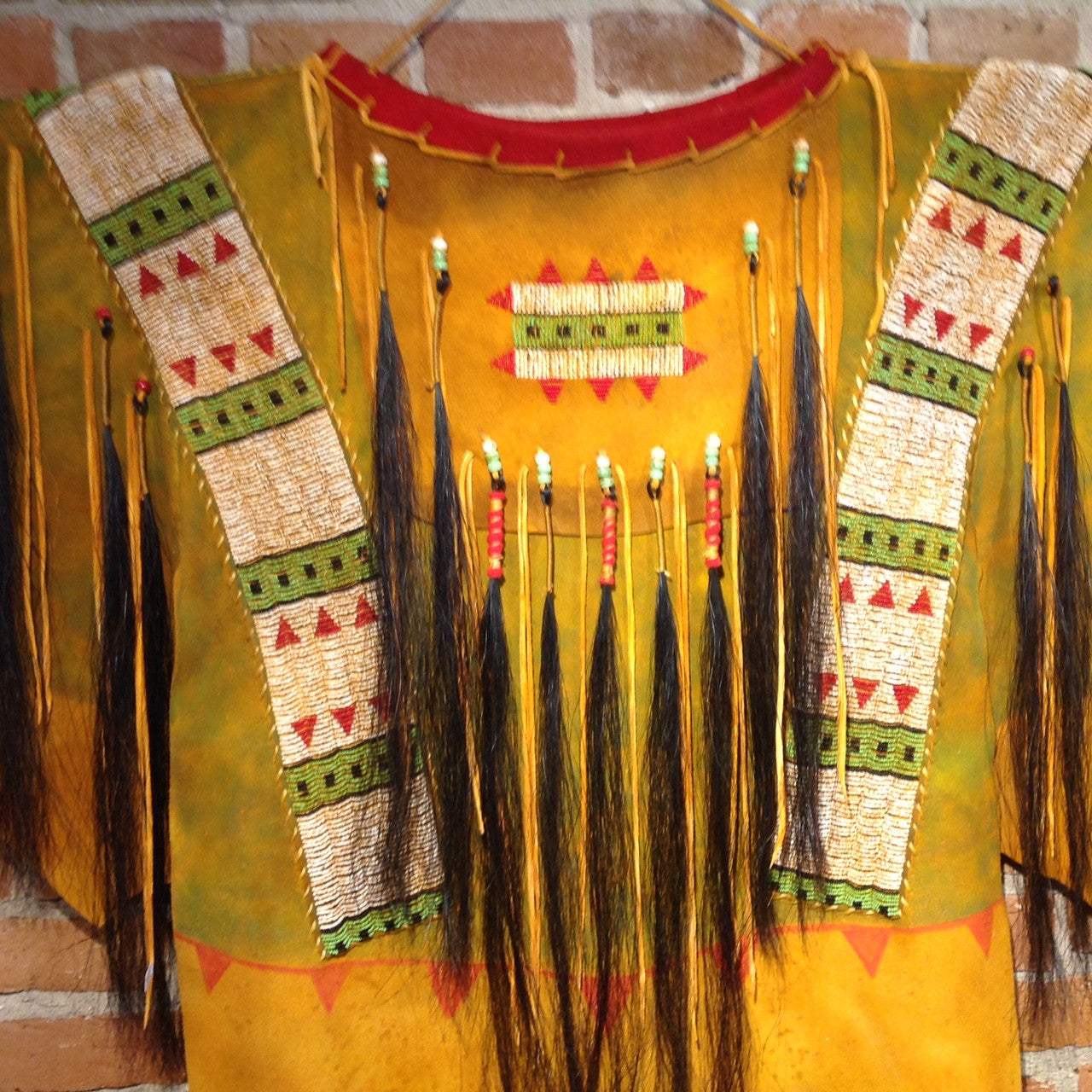 This shirt was inspired by an 1870's Lakota Sioux shirt in the National Museum of the American Indian. The red stripes on the lower arms of the shirt represent coup marks, which could be earned for various exploits in battle, such as riding close enough to an enemy to touch him, battles participated in, horses stolen, and other acts of bravery.