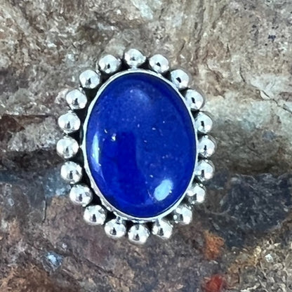 This stunning Sterling Silver Ring features Lapis Lazuli which is found in Afghanistan. Created by Navajo Artisan Artie Yellowhorse. Her trademark is the Silver Spheres which adorn her pieces, with each individual Sphere soldered by hand.