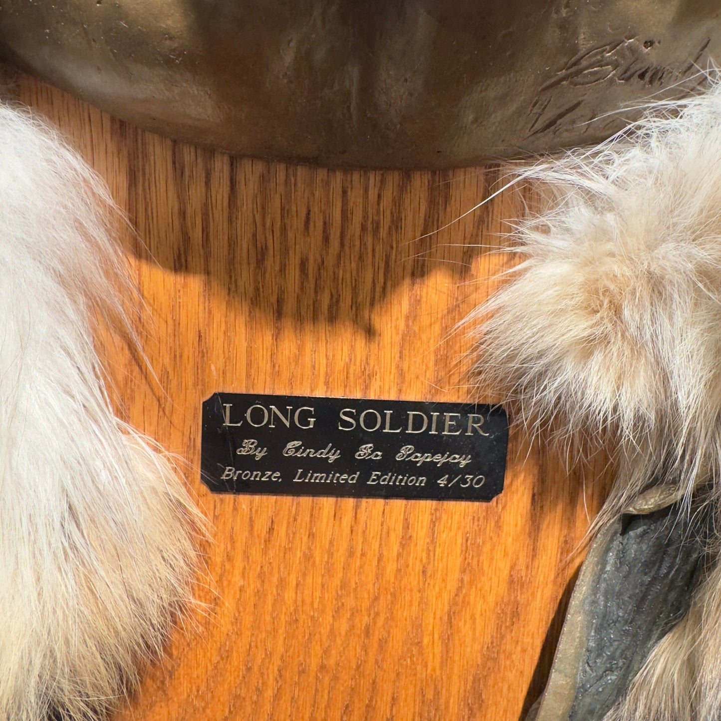 A rare and commanding bronze wall-mounted spirit mask by artist Cindy Jo Popejoy, Long Soldier is a powerful tribute to Indigenous strength and resilience. Cast in bronze and adorned with real fur, leather, and a turquoise-style necklace, this limited edition piece (only 30 made) features an expressive warrior face beneath a full animal headdress. Mounted on a wood plaque, it stands as a striking focal point in any Southwestern or Native American art collection.