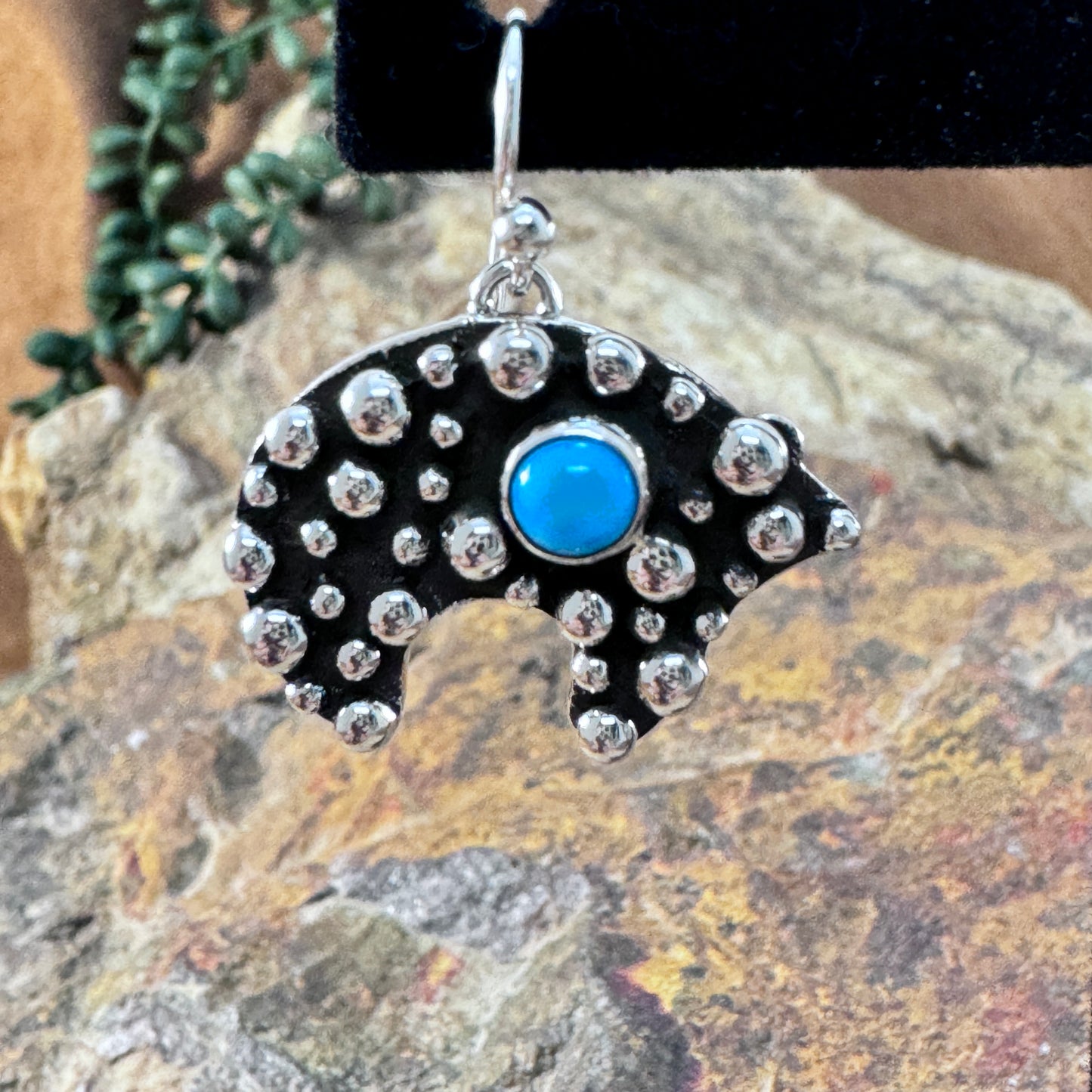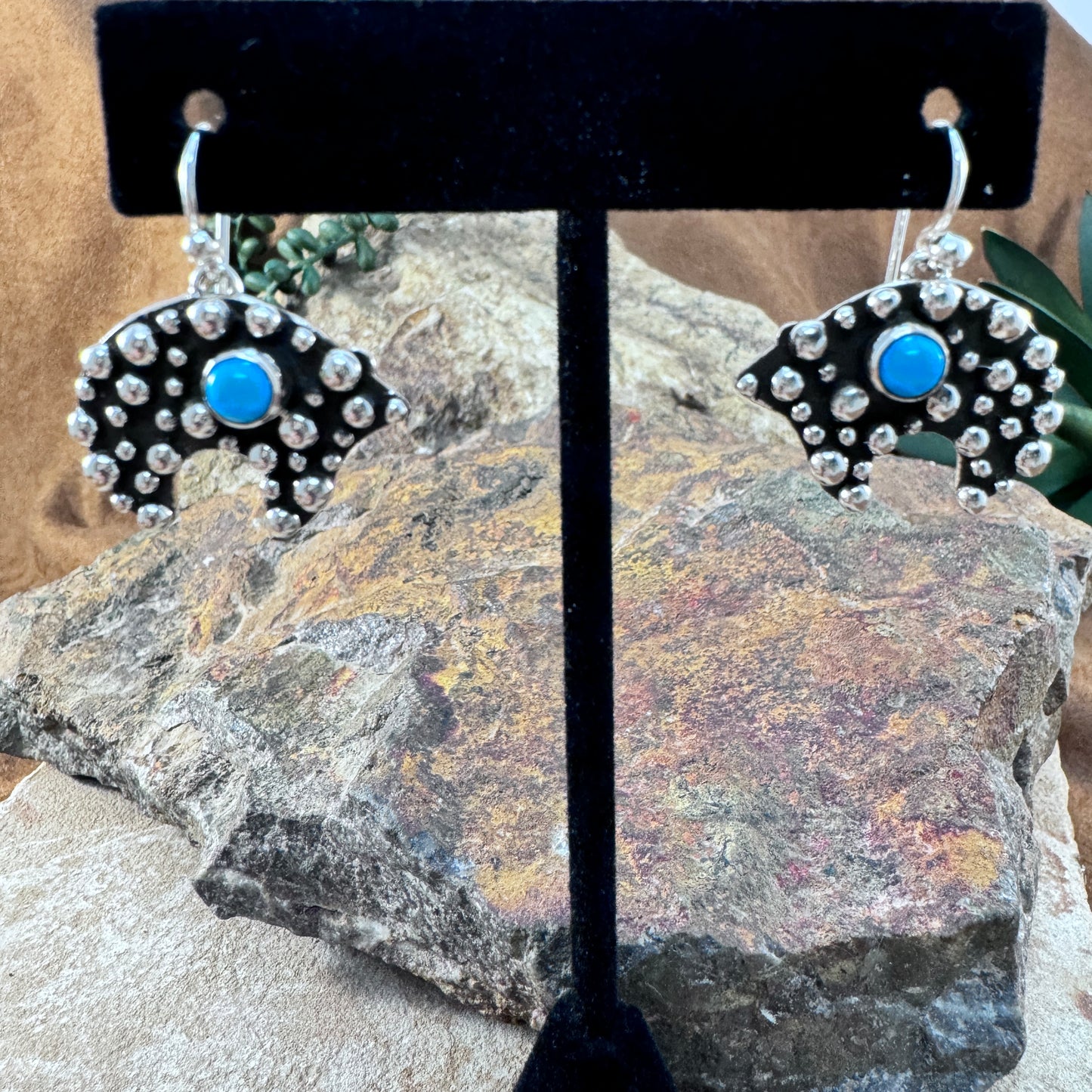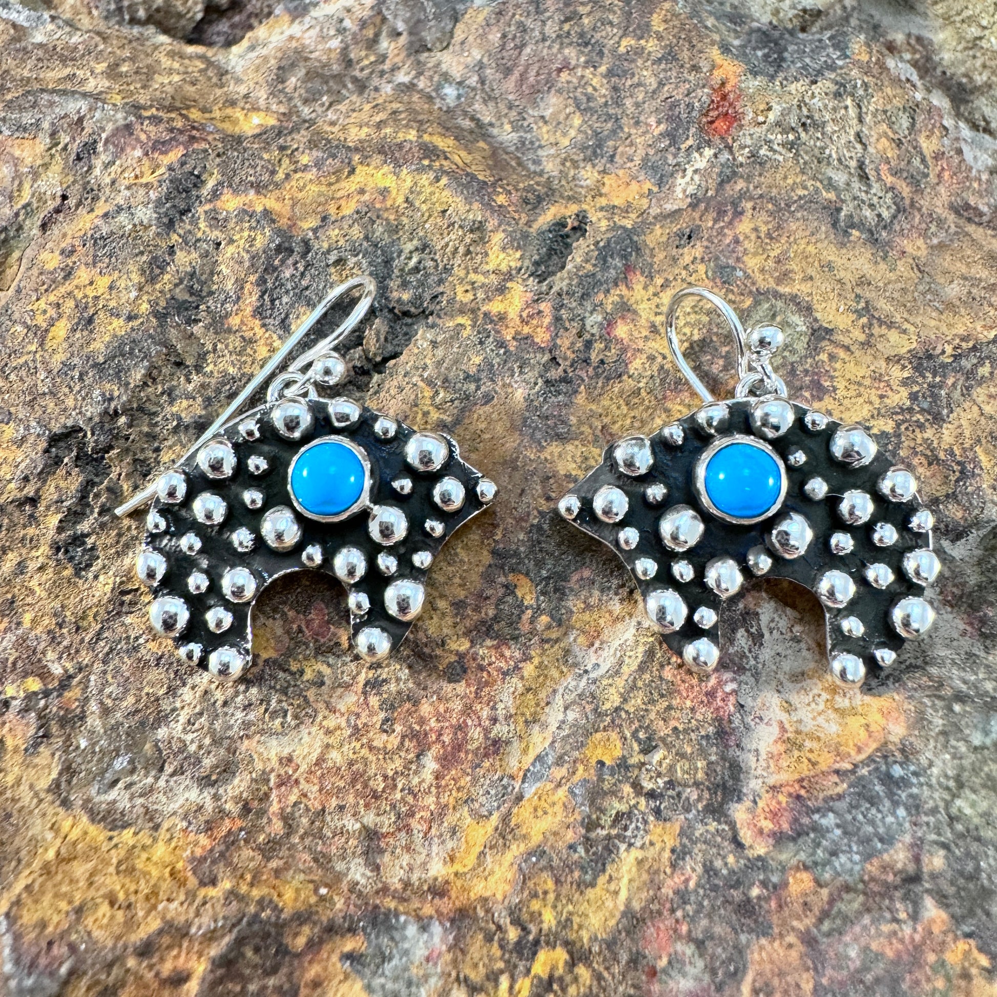 These beautiful Sterling Silver Bear Earrings are from the Million Drops Collection. They feature Kingman Turquoise set in a field of Silver Dots that are handcrafted and individually soldered on an Oxidized Silver background. Created by Santa Domingo silversmith. Colors may vary due to different computer monitors. .