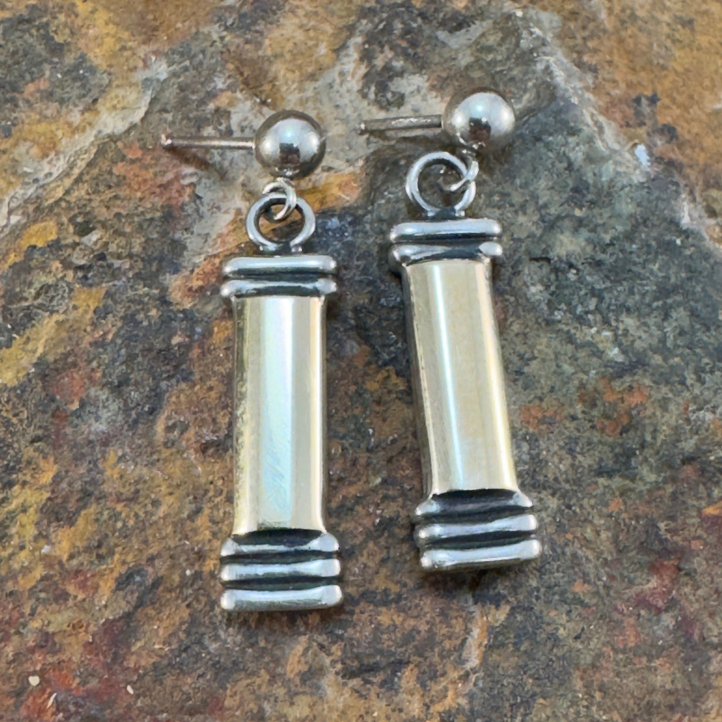Handcrafted by esteemed jewelry designer Michael Rogers, these elegant earrings feature a harmonious blend of sterling silver and 14K gold, reflecting the artist's dedication to traditional techniques and refined design. Each earring measures approximately 0.25 inches in width and 0.72 inches in length, making for a subtle yet distinctive presence. With secure post backings, these earrings are perfect for any occasion.