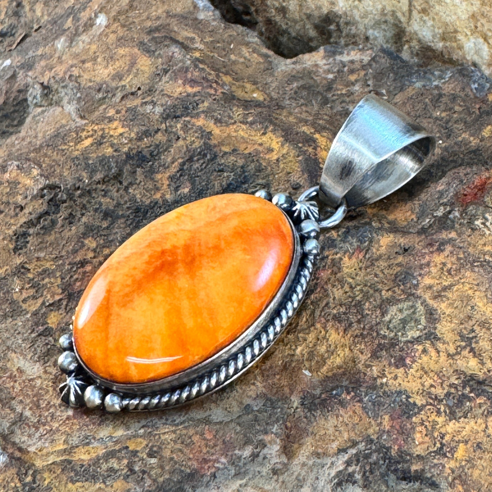 This radiant pendant showcases a vibrant orange spiny oyster shell, polished to a luminous finish and framed in sterling silver. The elongated oval stone is surrounded by a twisted rope border, silver drop accents, and hand-stamped starburst details above and below. A brushed silver bail provides a secure fit for most chains or beads.
