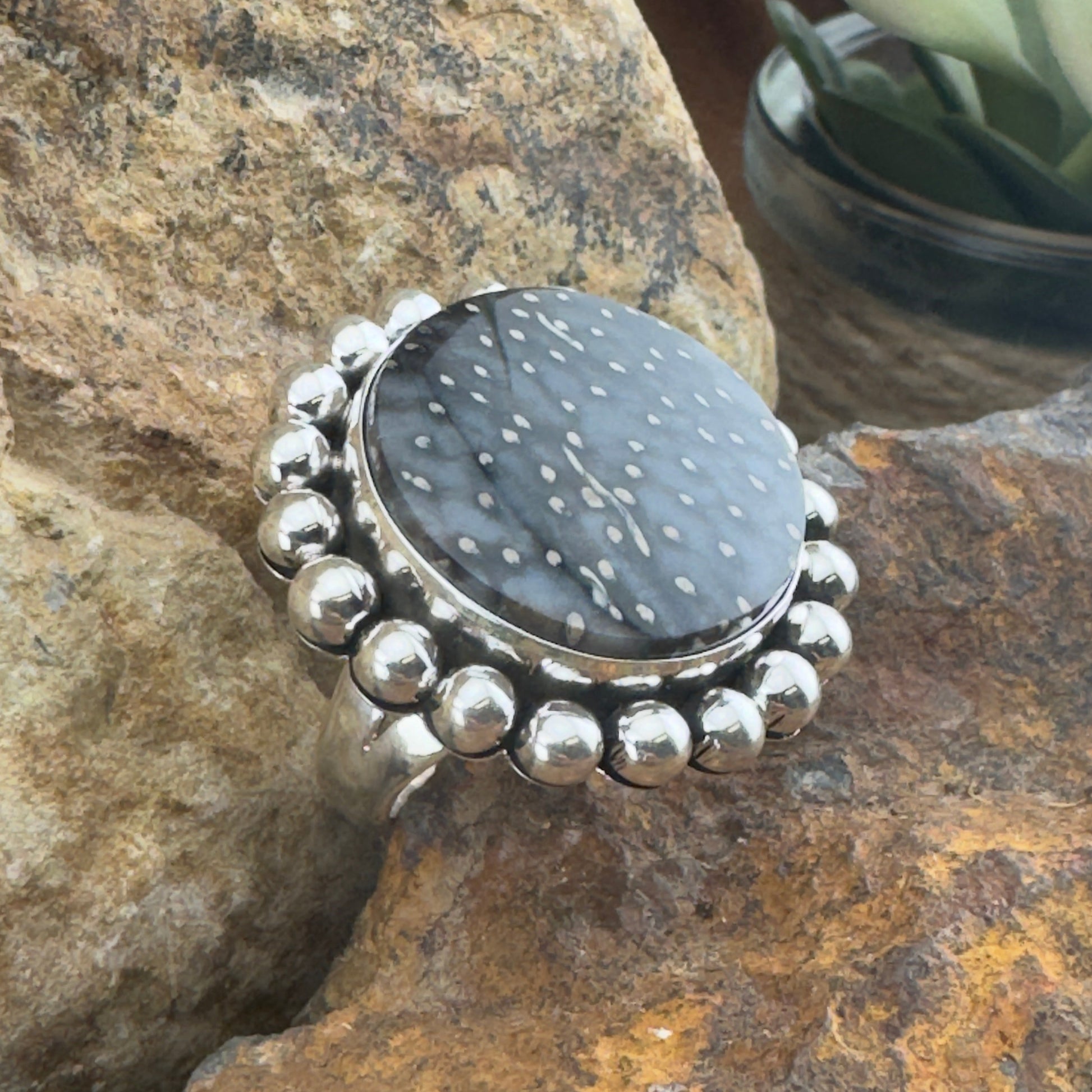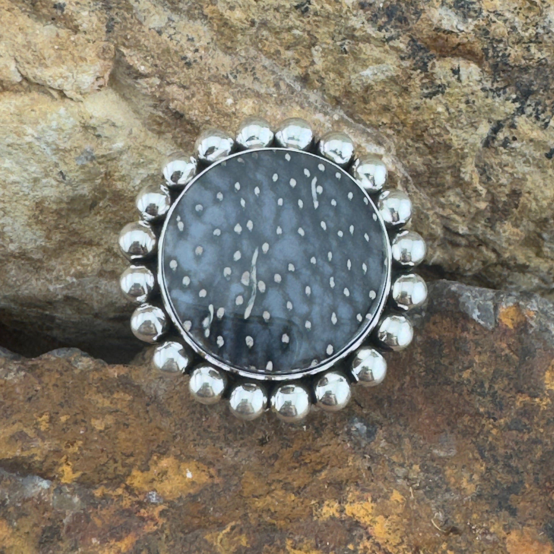 This unique handcrafted ring features polished fossilized palm wood set in sterling silver. The organic, dotted pattern of the palm wood—ranging from dark brown to black with creamy speckles—is beautifully accented by a surrounding border of high-polished silver beads. It features her trademark Silver Spheres which adorn her pieces, with each individual Sphere created and soldered by hand.