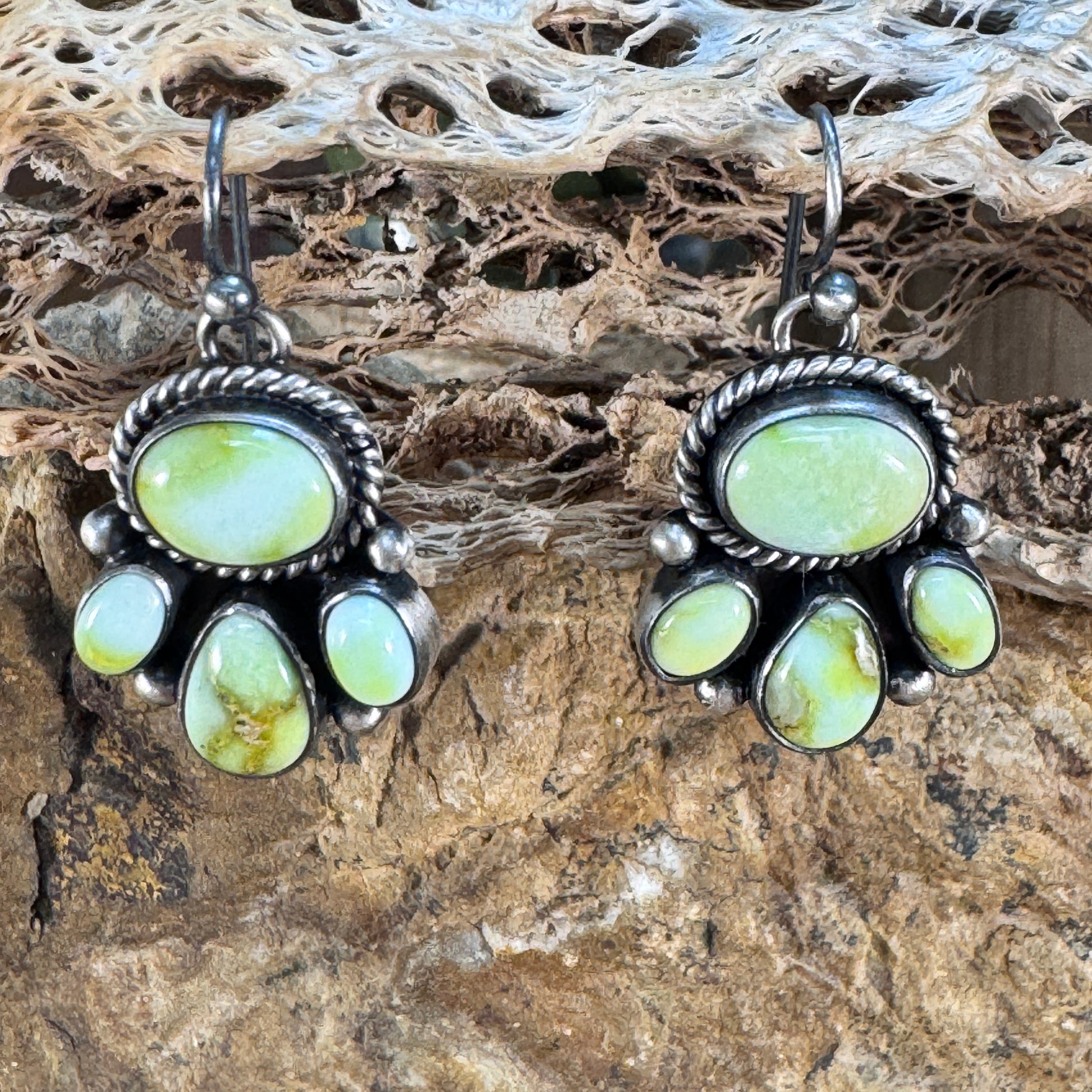 These striking earrings feature natural Palomino Variscite —known for its creamy golden hues with subtle apple green undertones—arranged in a soft cluster design. Each earring showcases four hand-cut cabochons set in oxidized sterling silver with traditional Navajo twist wire and drop bead accents. The layout highlights the gentle contrast between the stone’s soft tones and the darkened silver, creating a warm, earthy elegance perfect for everyday wear or a special evening out.