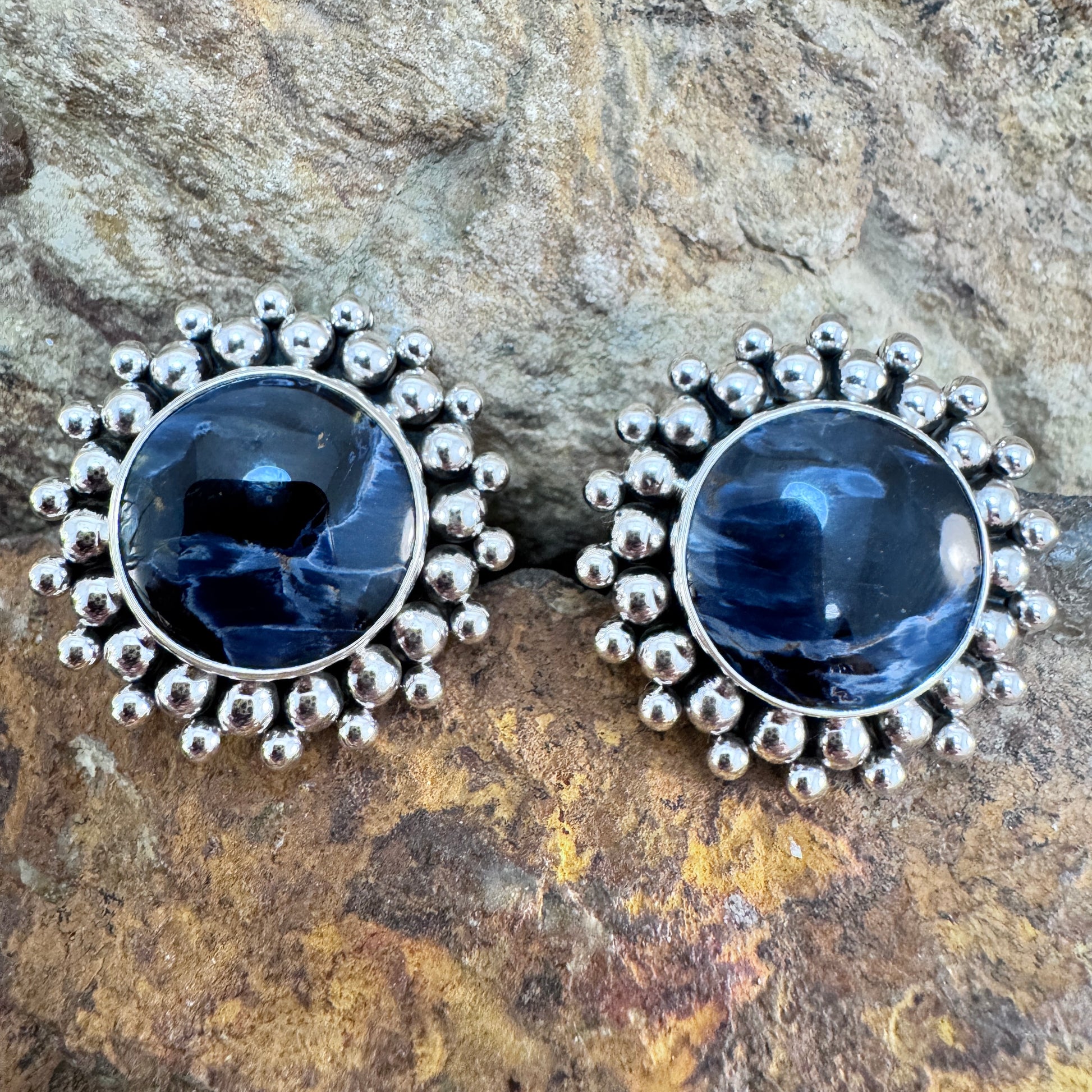 These captivating earrings feature round cabochons of deep blue pietersite, known for its dramatic swirling patterns and flashes of chatoyance. Each stone is bezel-set in sterling silver and encircled by a radiant halo of hand-applied sterling silver spheres, adding bold dimension and elegant movement. Whether worn day or night, these earrings offer a striking blend of natural energy and Southwestern craftsmanship. Created by Navajo Artisan Artie Yellowhorse. Her trademark is the Silver Spheres which adorn her pieces, with each individual Sphere soldered by hand.