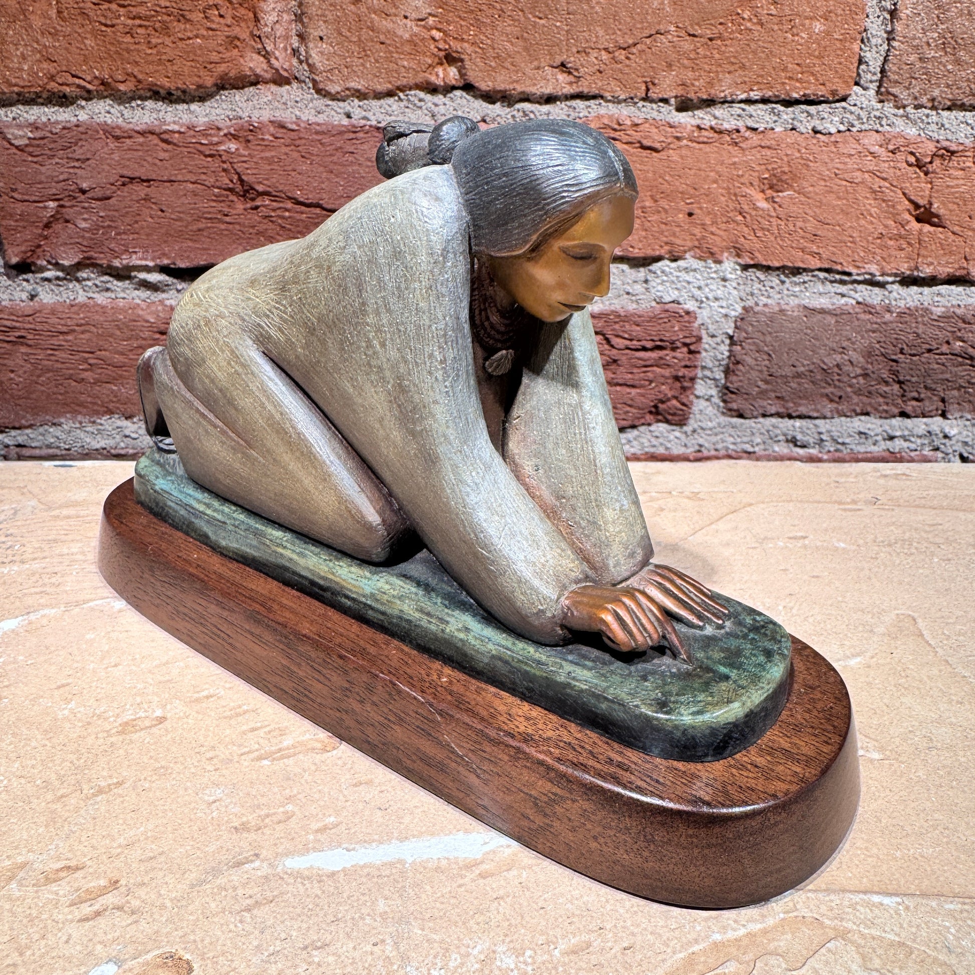 This bronze captures a moment of quiet devotion and connection to the land. A Pueblo woman kneels gently, gathering piñon nuts with care—a scene reflecting gratitude and patience of harvest. Fragua’s sculpture radiates humility and balance, blending realistic posture with graceful abstraction. The earth-toned patina and smooth finish create a tactile warmth that draws the viewer into her contemplative world.