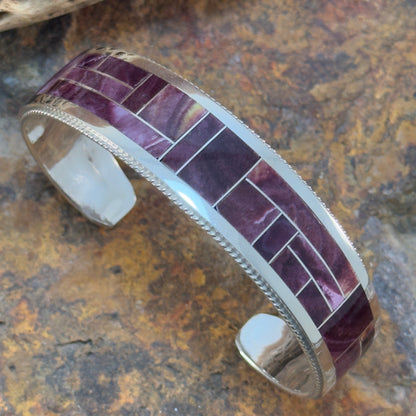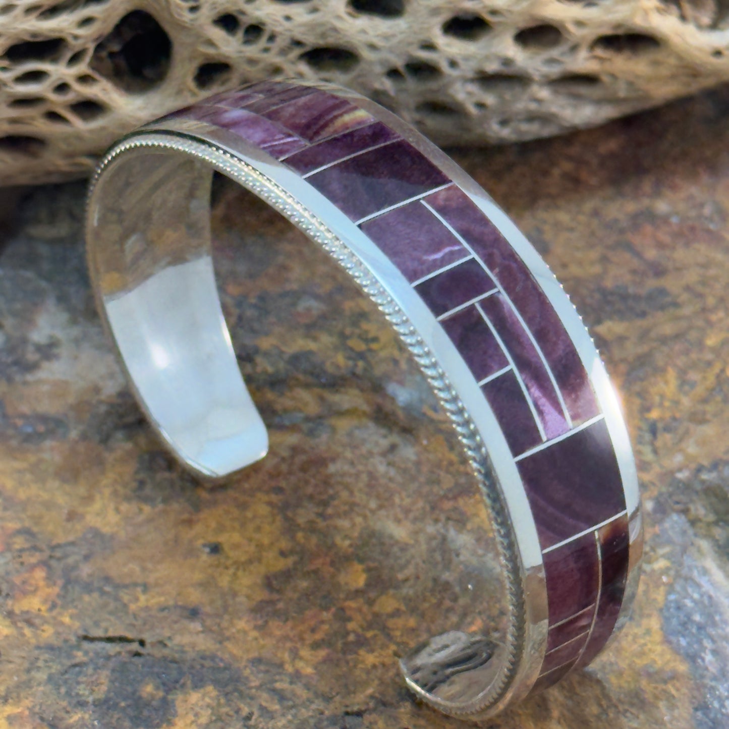 This eye-catching cuff showcases deep purple spiny oyster shell, expertly inlaid in a geometric mosaic design. Rich plum and violet tones play across the surface, framed in polished sterling silver and bordered with delicate twist wire. Bold and contemporary, yet rooted in tradition, this piece highlights the natural beauty and variety of spiny oyster shell in a modern Southwest style.
