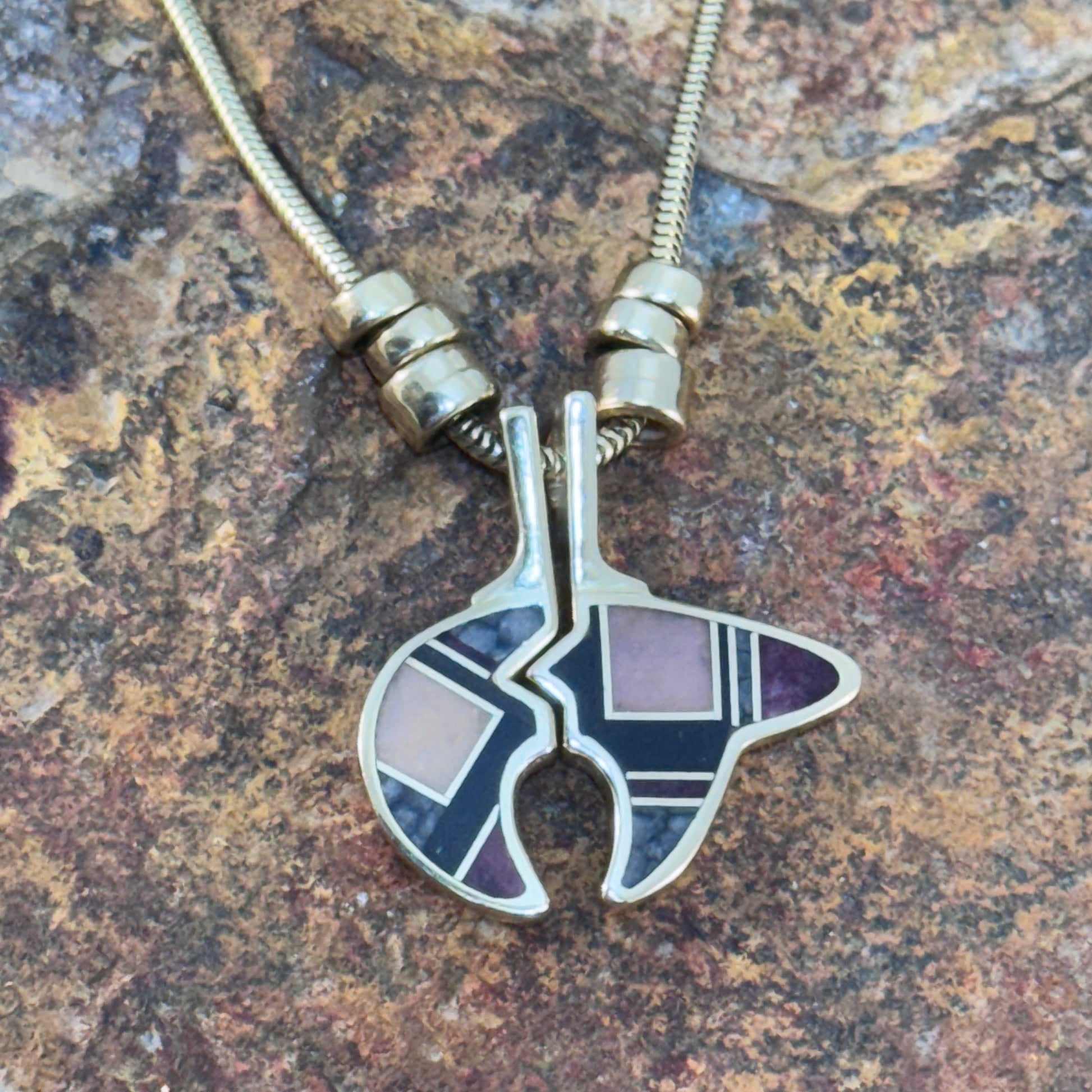Black Arrow presents this masterfully handcrafted bear pendant by renowned Navajo artist Ray Tracey. Made of solid 14k gold, the bear is split into two symmetrical halves, each adorned with bold stone inlay. One side features black jade, sugilite, and opal inlays, while the reverse showcases orange spiny oyster. Suspended from a 14k gold omega chain with accent beads, this pendant is a statement of balance, strength, and duality.