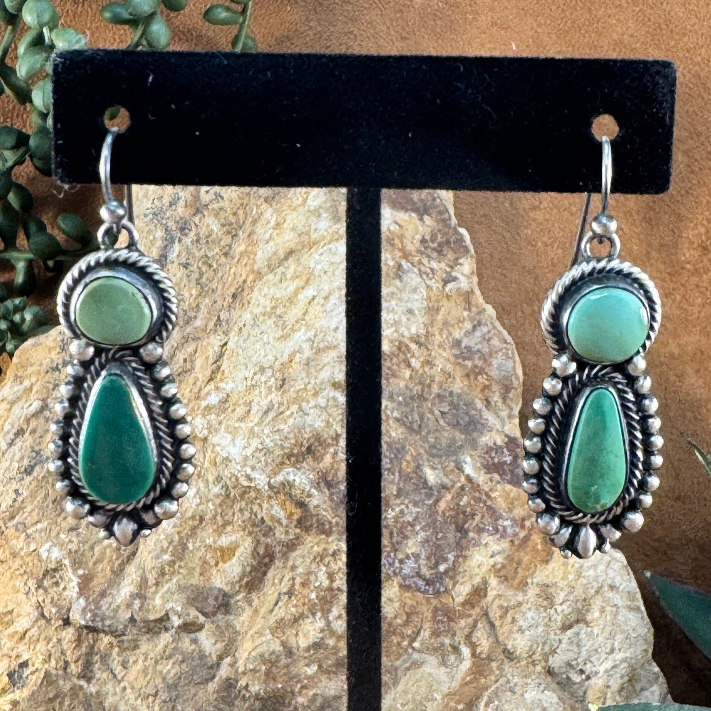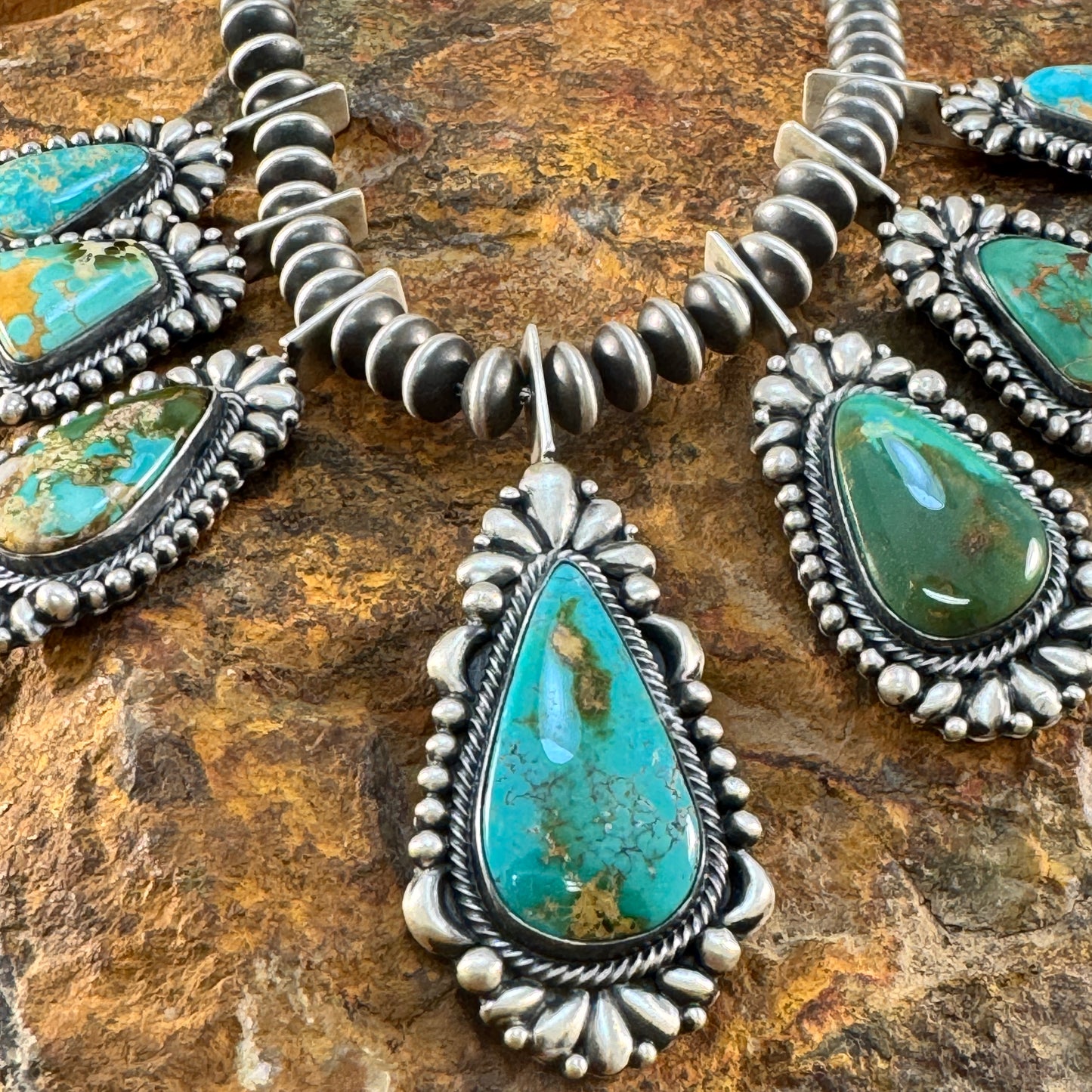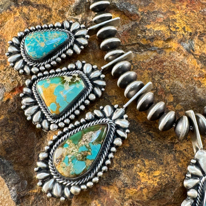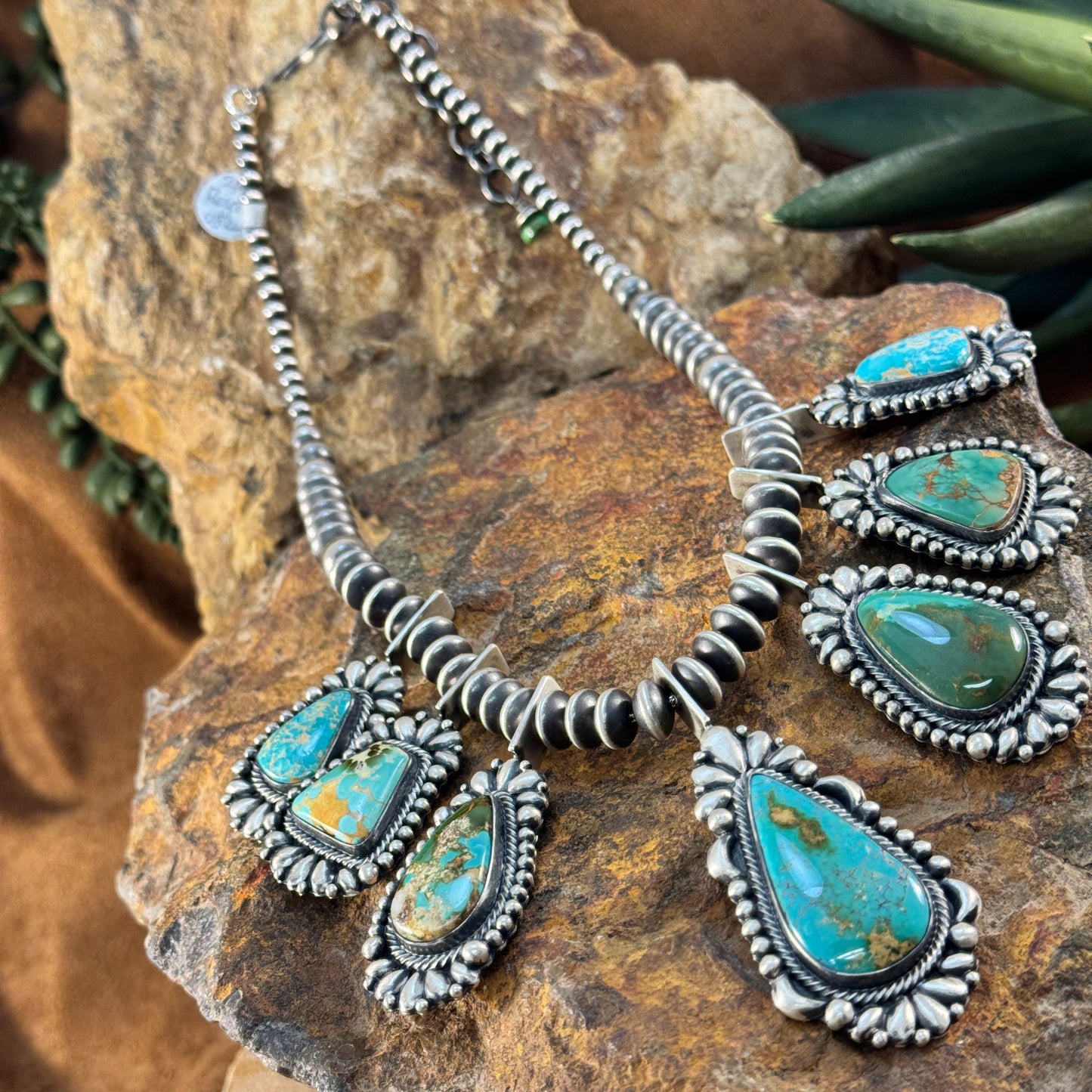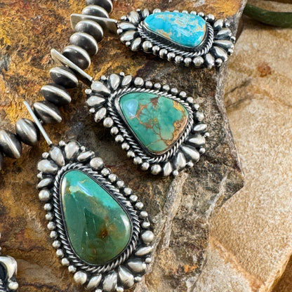 This stunning handcrafted set by renowned Native American artist Diane Wylie showcases the vibrant beauty of Royston turquoise. Known for its unique blend of blue and green hues with golden brown matrices, Royston turquoise adds an earthy elegance to this design. The necklace features five beautifully bezel-set turquoise pendants, each adorned with intricate silver beadwork and rope detailing, giving a classic yet bold look. The matching earrings mirror the elegance of the necklace with their two-tiered turquoise stones framed by sterling silver bead accents.