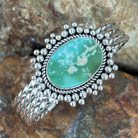 This beautiful Sterling Silver Bracelet features Royston Turquoise. Created by Navajo Artisan Artie Yellowhorse. Her trademark is the Silver Spheres which adorn her pieces, with each individual Sphere soldered by hand.