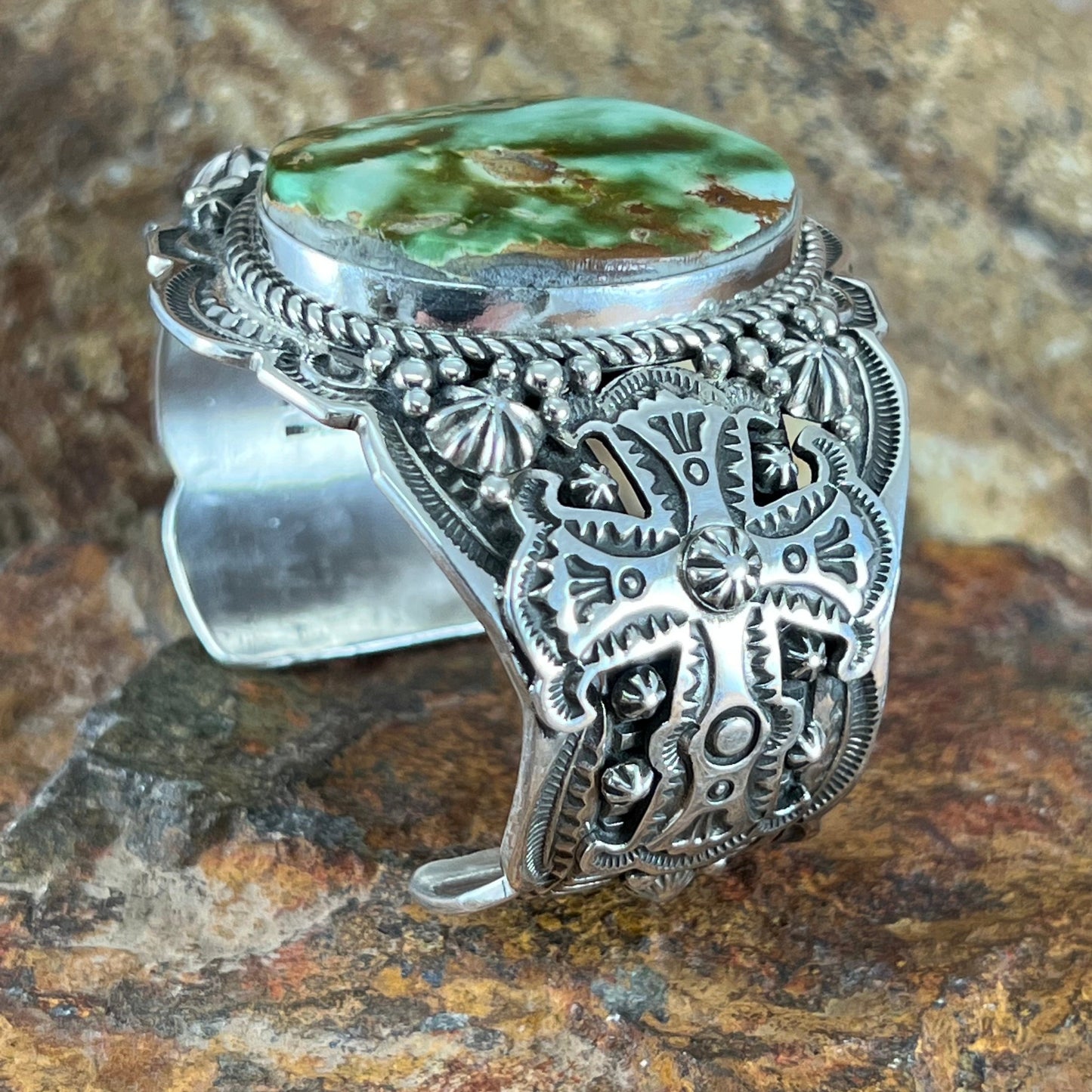 This beautiful sterling silver Cuff Bracelet features Royston Turquoise found in the original Royston Mines, near Tonapah, Nevada. Created by Navajo jewelers and Navajo silversmiths. Colors may vary due to different computer monitors.