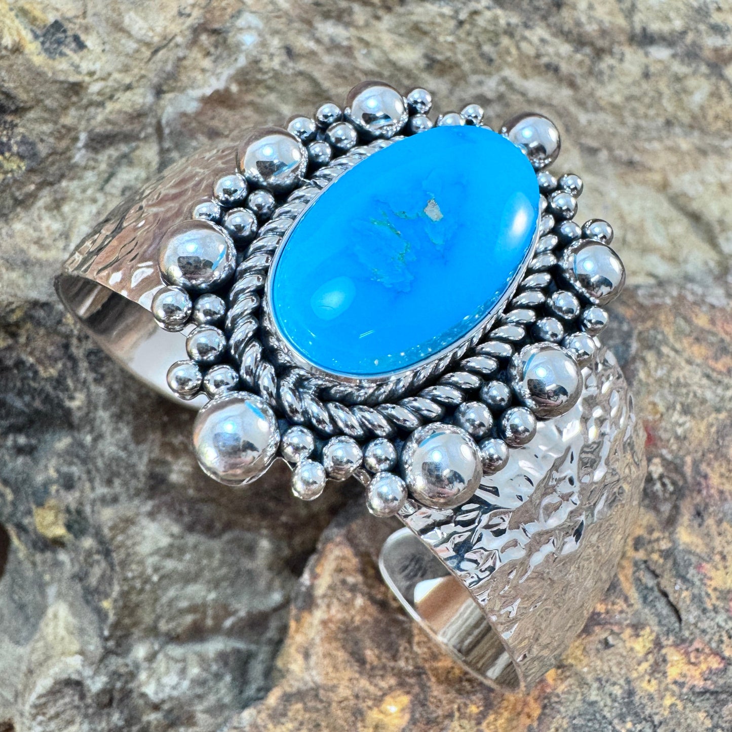 A stunning Sleeping Beauty Turquoise cuff bracelet that highlights the exquisite beauty of this highly sought-after gemstone. The vivid blue turquoise centerpiece is surrounded by a rope-twist bezel and framed by and crafted sterling silver spheres. The hammered texture of the wide cuff adds a rustic yet elegant touch, complementing the intricate silverwork. A perfect statement piece for any jewelry enthusiast.