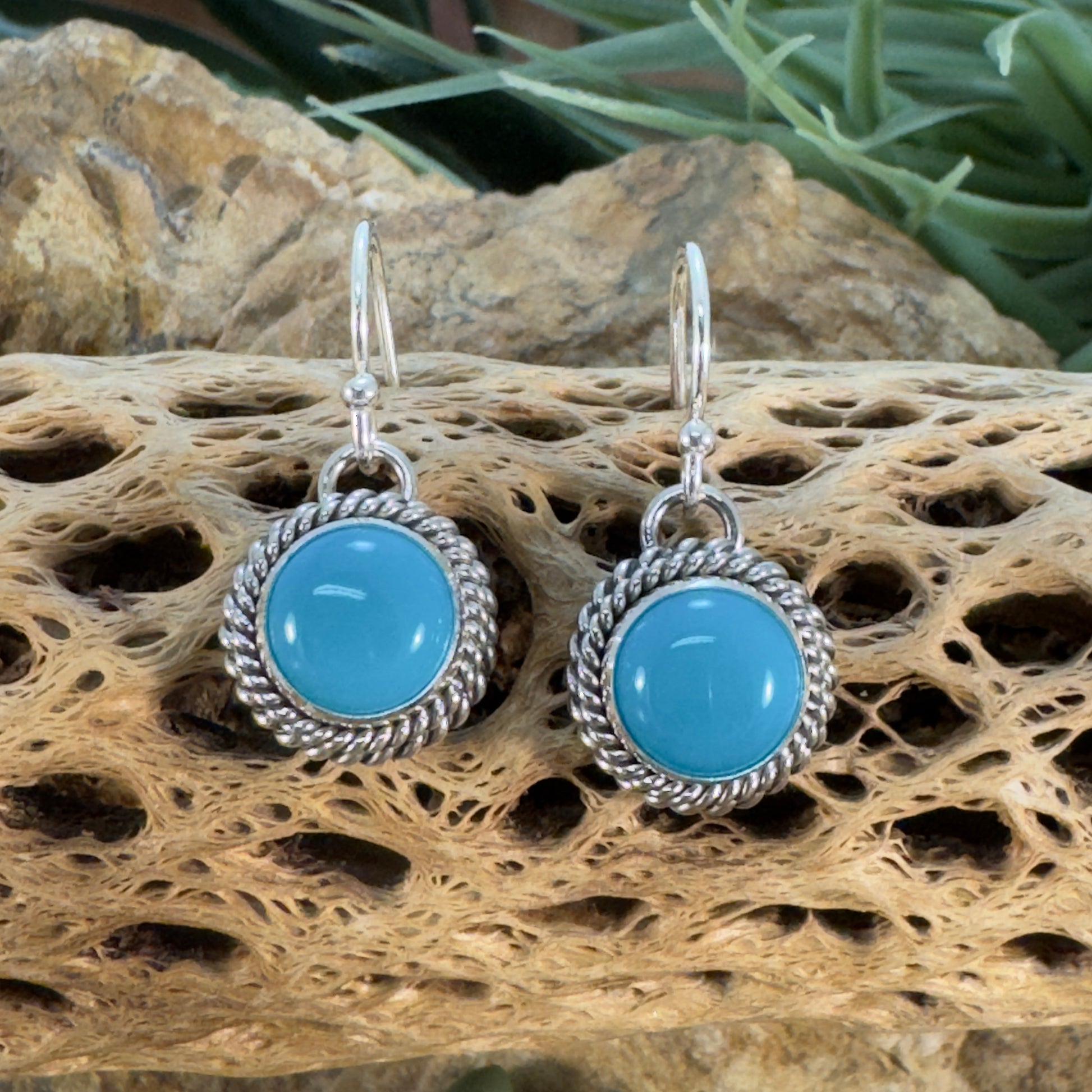 These petite handcrafted sterling silver earrings feature radiant round cabochons of rare Sleeping Beauty Turquoise. Each stone is bezel-set and framed with twisted rope detail.