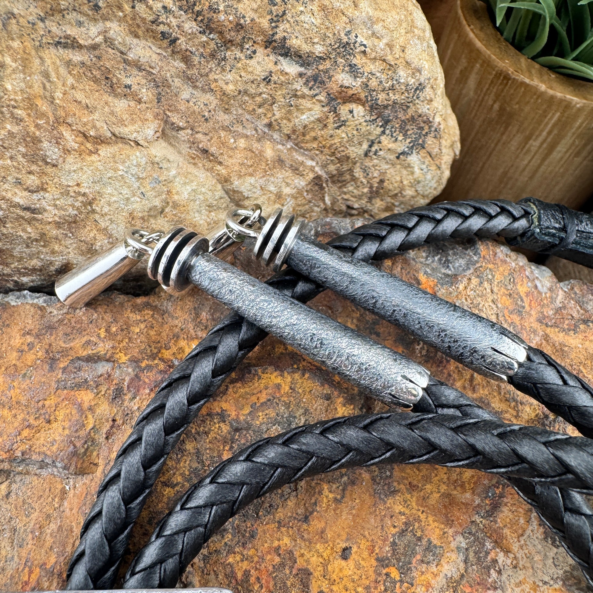 Jack Tom's Sonoran Gold Turquoise bolo tie showcases masterful silversmithing with its striking cabochon stone set within layered overlay and sandcast sterling silver. The warm, golden-hued turquoise is framed by intricate silver detailing that demonstrates traditional Navajo craftsmanship. Suspended from a supple braided black leather cord, the piece concludes with textured sandcast silver tips. Polished to perfection, this bolo represents the convergence of natural stone beauty and expert metalwork—a refined accessory that honors authentic Native American artistry and enduring design.