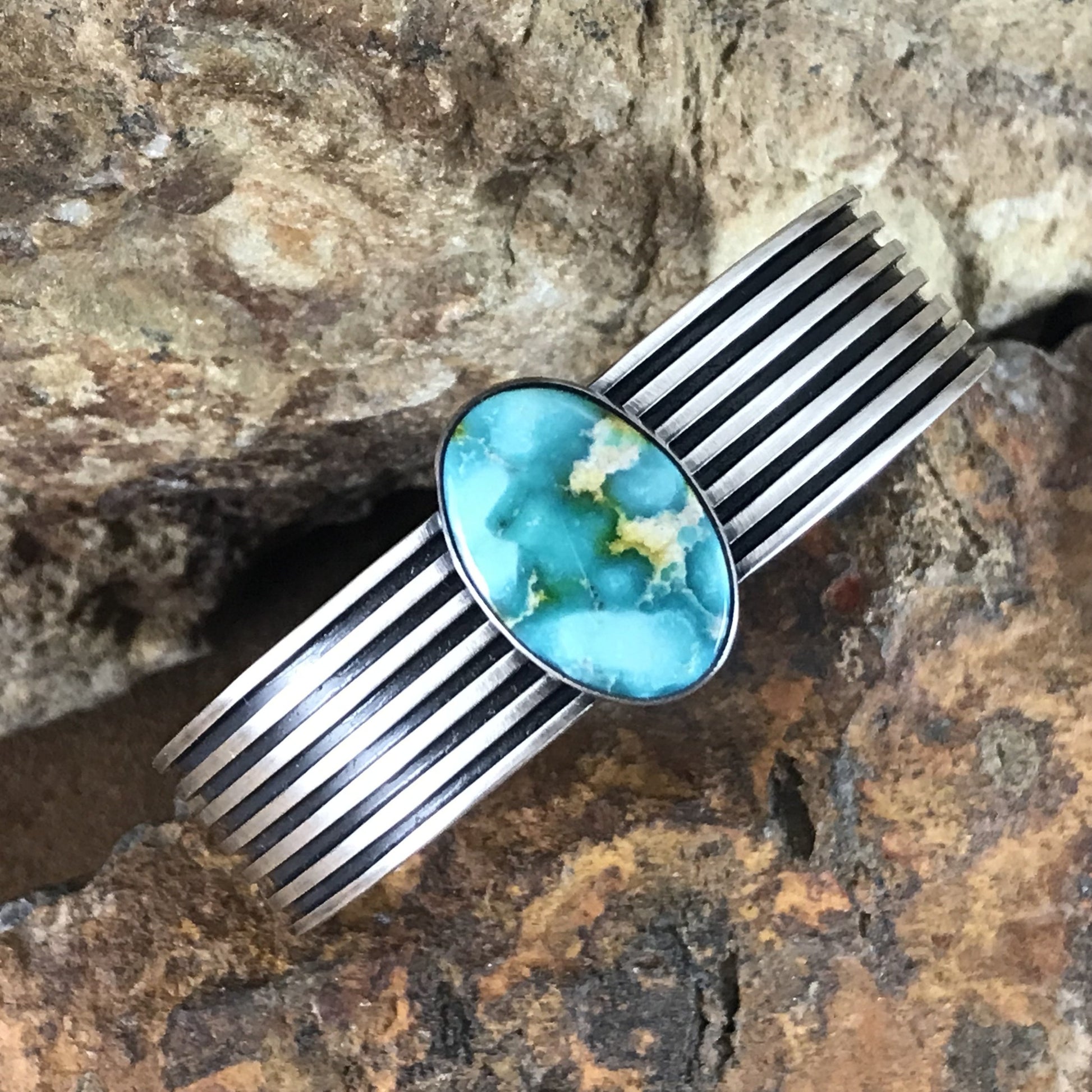 This beautiful Sterling Silver Bracelet showcases the spectacular Green, Blue and Yellow hues of Sonoran Gold Turquoise from Mexico. Silver work is simple contemporary with a traditional finish. Handcrafted by Native American artists. Colors may vary due to computer monitor. This is a one-of-a-kind piece.