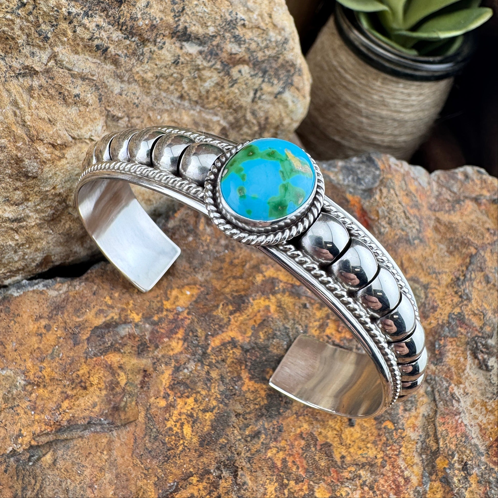 Showcasing a striking oval cabochon of Sonoran Gold turquoise, this sterling silver cuff combines sleek contemporary style with timeless silversmith craftsmanship. The focal stone is accentuated by a sequence of domed silver arches and bordered with traditional twisted wire detailing.