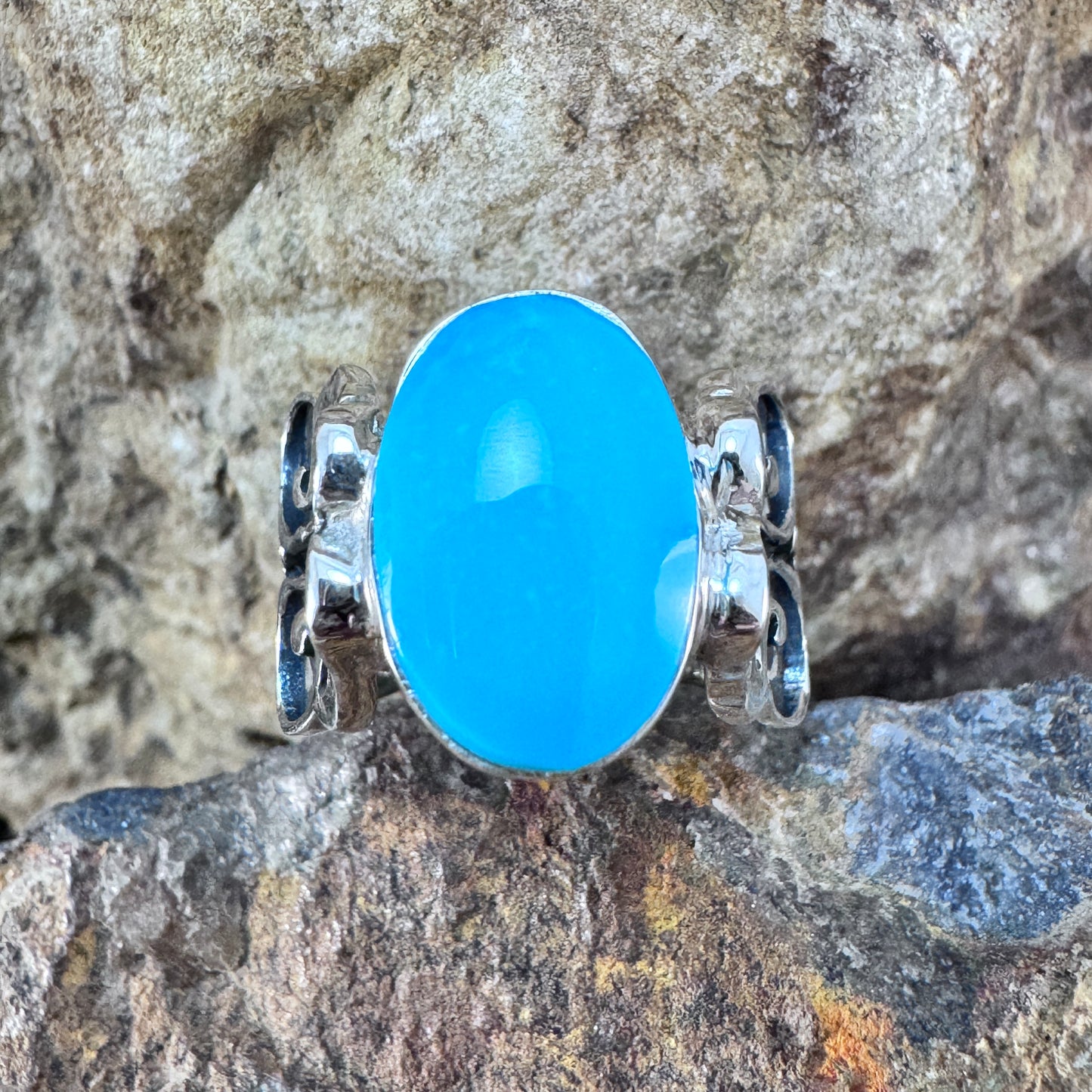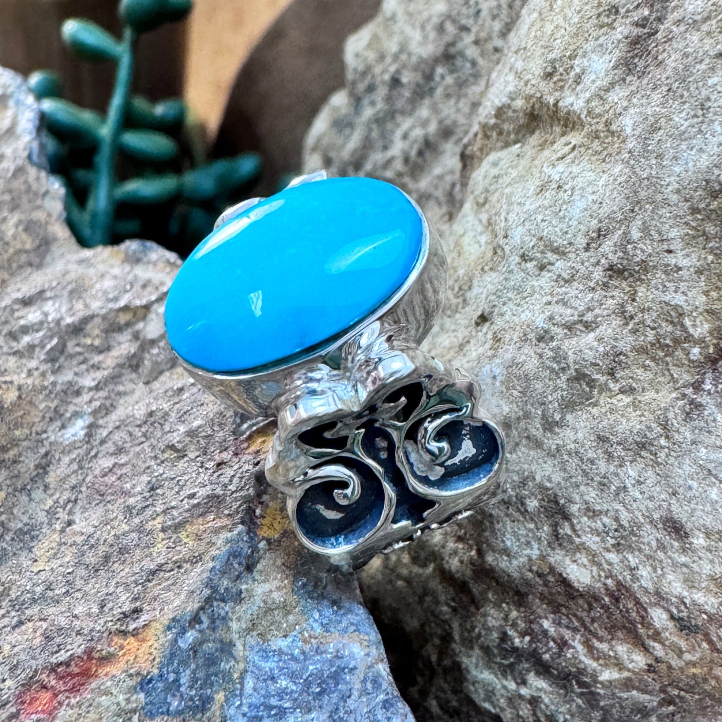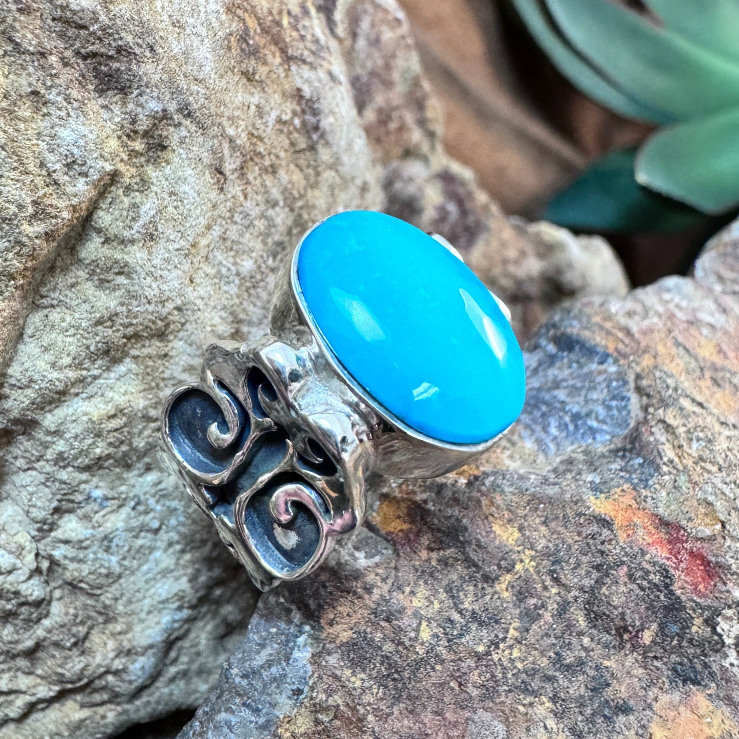 This striking sterling silver ring with Kingman Turquoise as its centerpiece, exudes the elegance and beauty. The wide band is intricately adorned with swirling silver details, giving the piece a unique and artistic touch. Perfect for formal occasions or to add a sophisticated statement to your everyday look, this ring combines modern design with timeless charm.