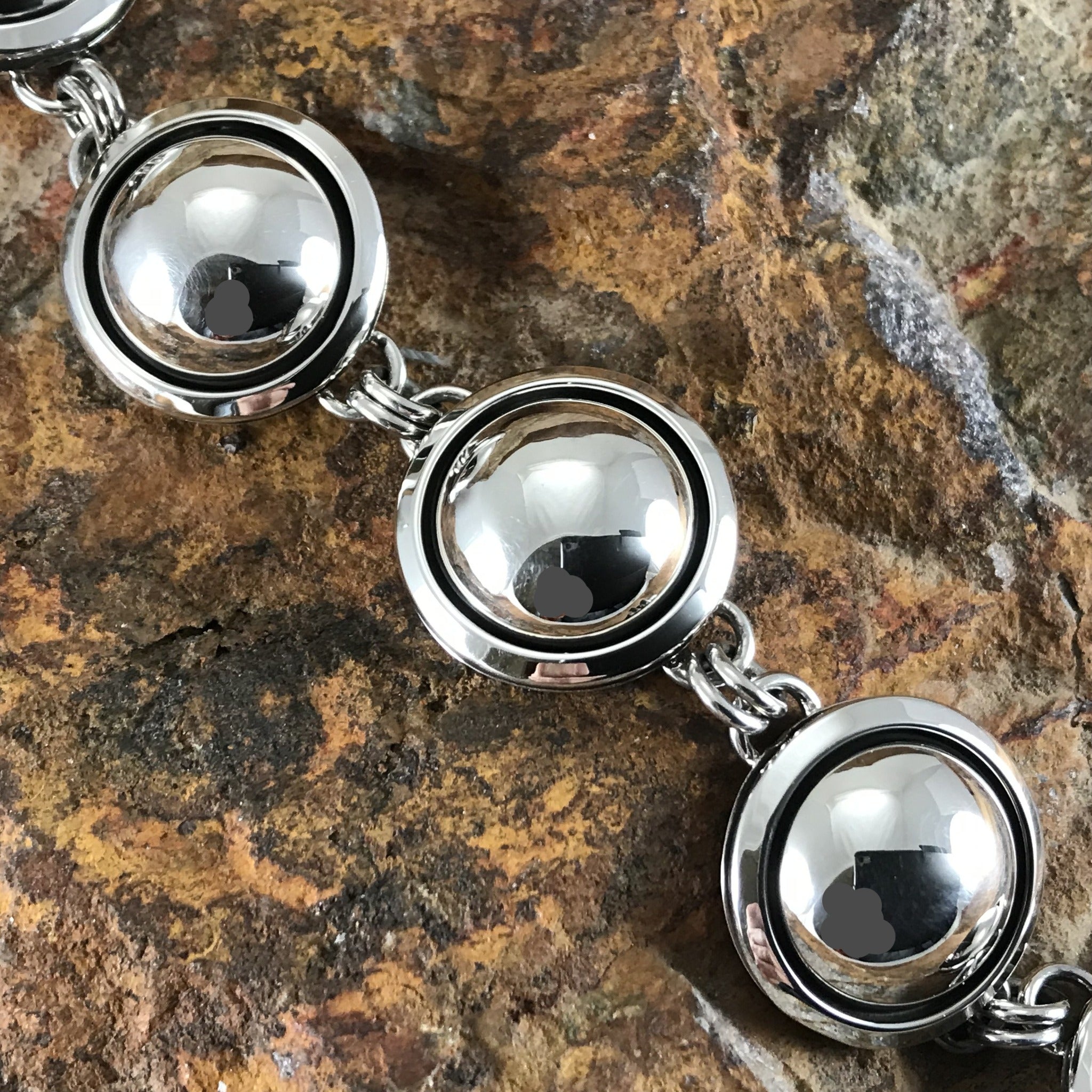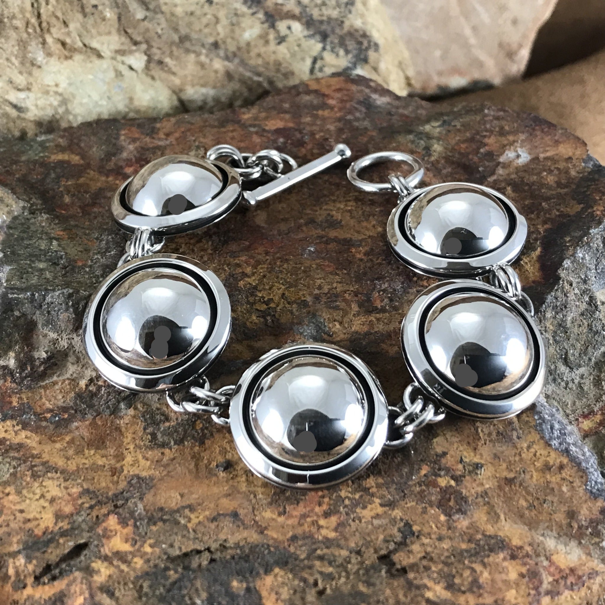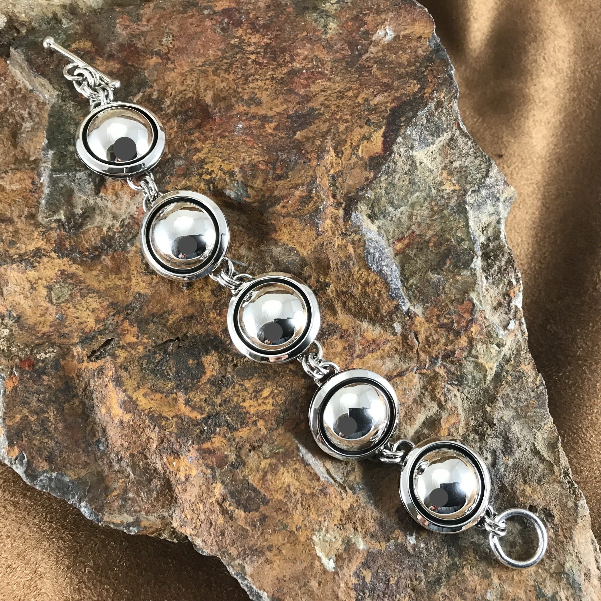 This bold Sterling Silver Link Bracelet features a series of Links of Silver Dome Spheres in a classic shadow box design. Created by Navajo Artisan Artie Yellowhorse.