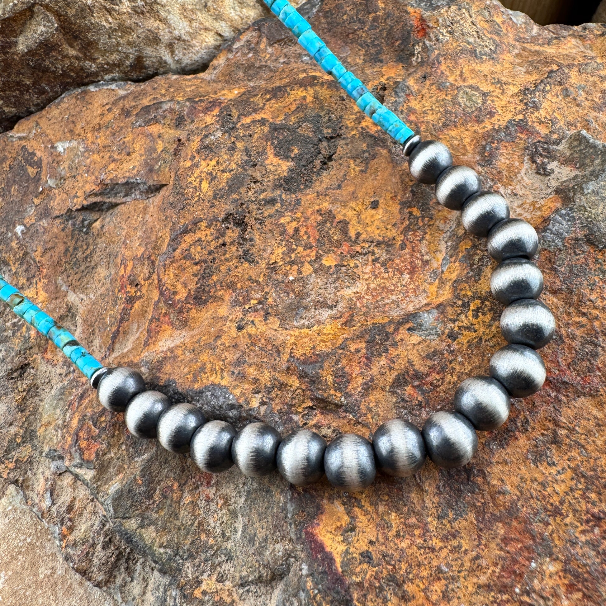 This modern classic blends natural Kingman turquoise heishi with a focal arrangement of oxidized 8mm Navajo pearls. The graduated sterling silver beads add weight and traditional Navajo elegance, while the smooth turquoise disc beads bring vibrant contrast. At 18 inches with a 2-inch extender and lobster clasp, it layers beautifully or stands on its own.