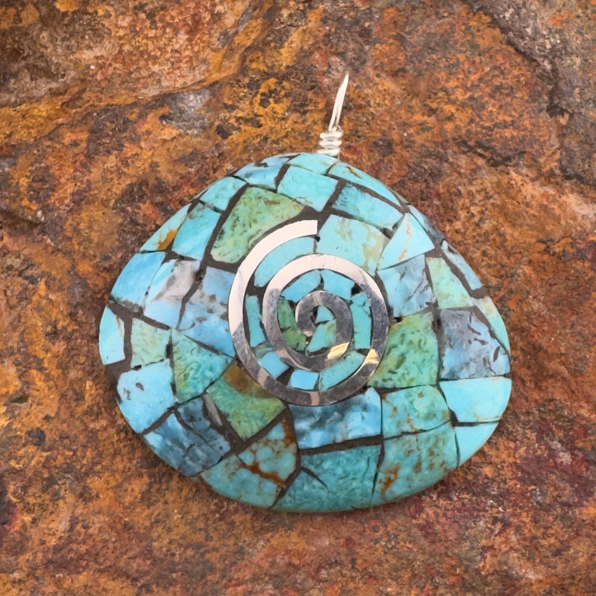 These striking mosaic pendants are handcrafted by renowned Santo Domingo artist Ronald Chavez, known for his intricate inlay techniques and use of natural materials. Each pendant features hand-cut turquoise stone set in a mosaic pattern over a natural shell base, overlaid with sterling silver designs that reflect cultural symbols of renewal, movement, and connection to nature.