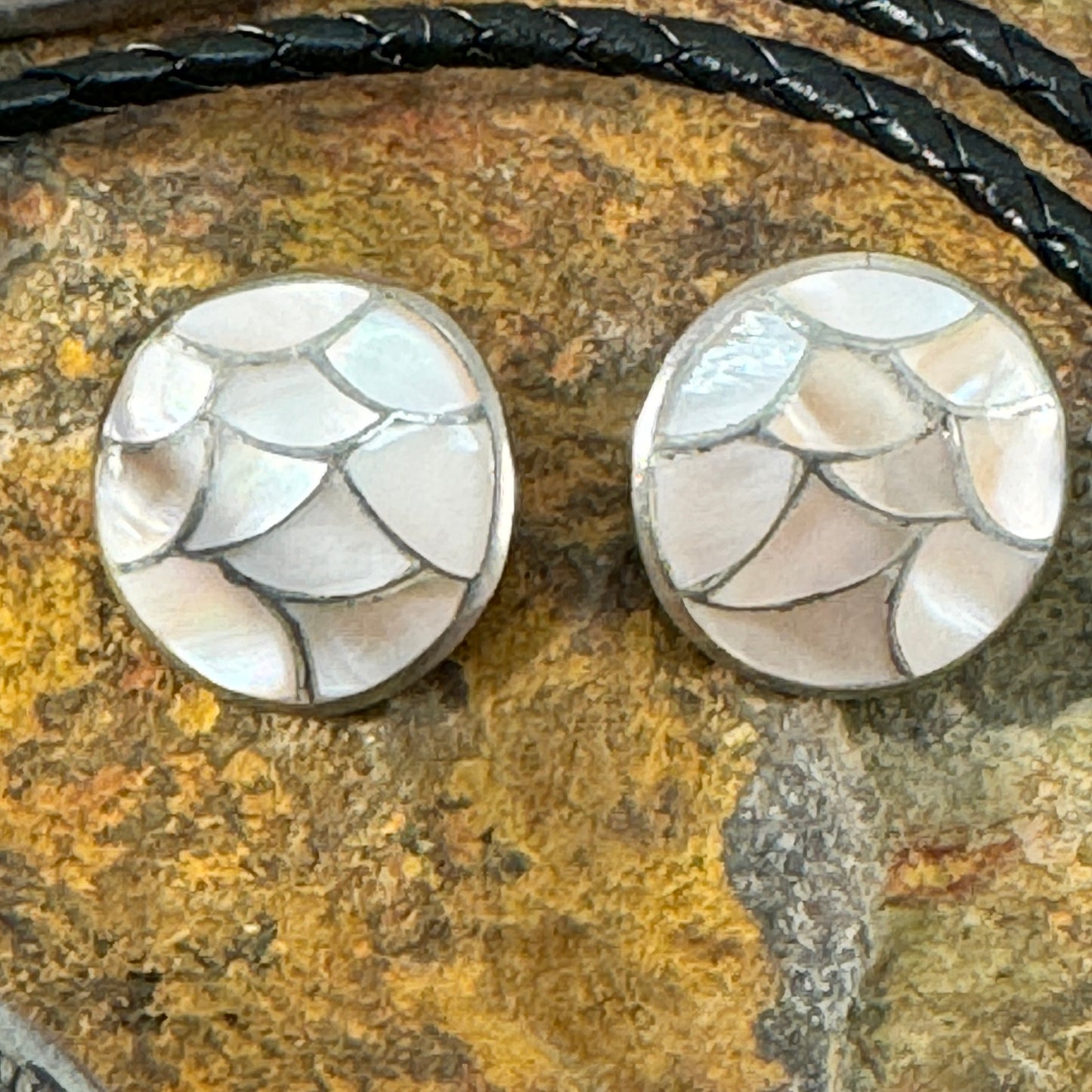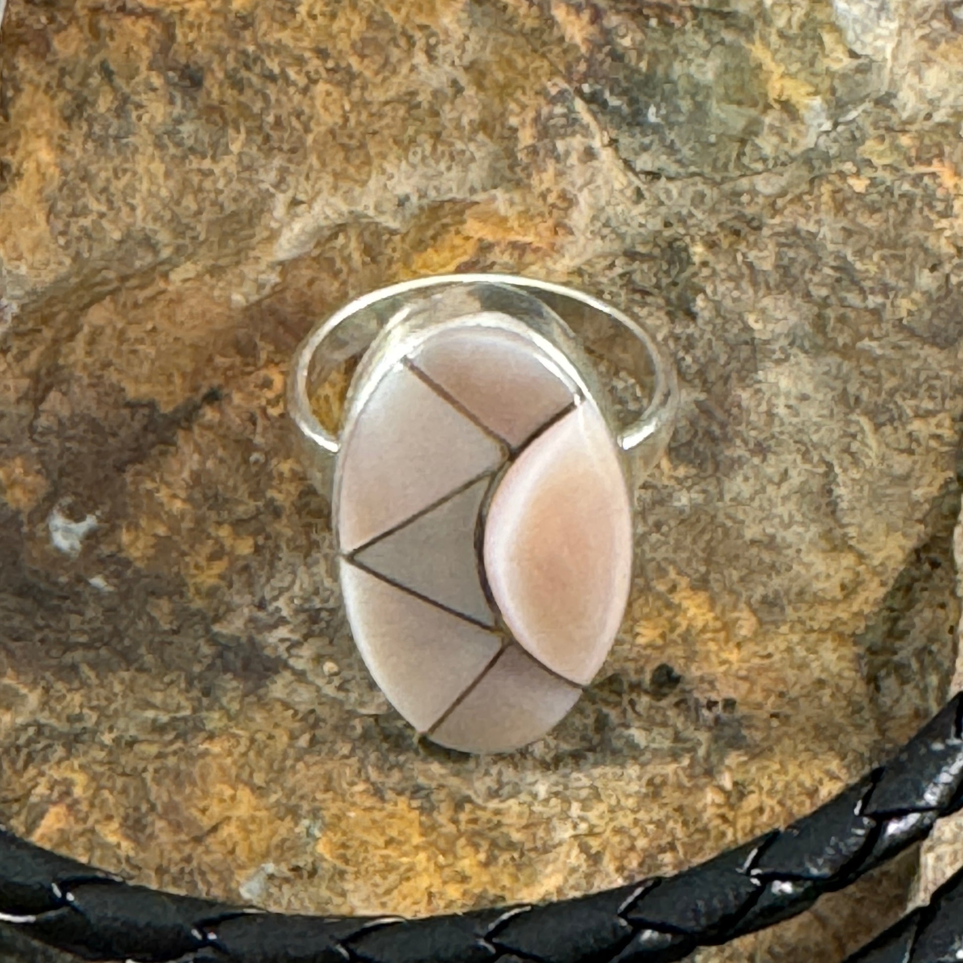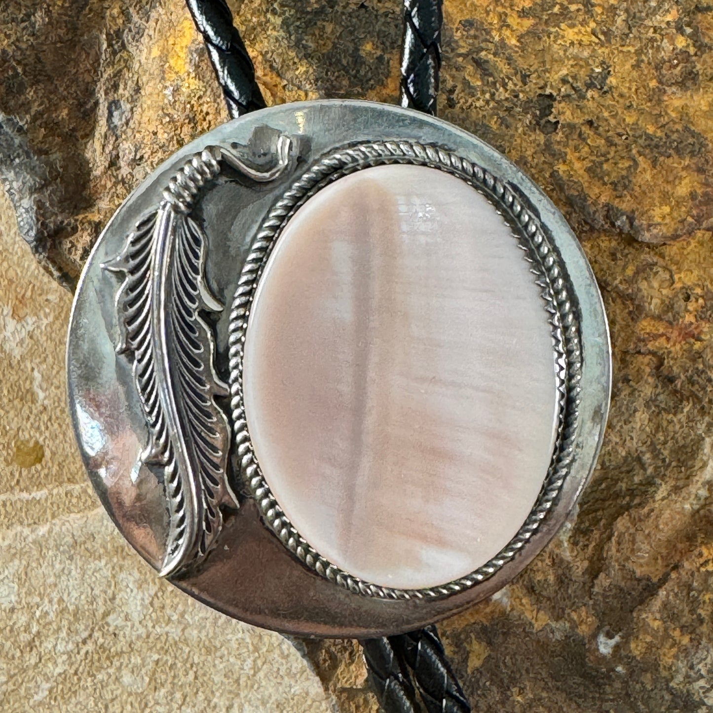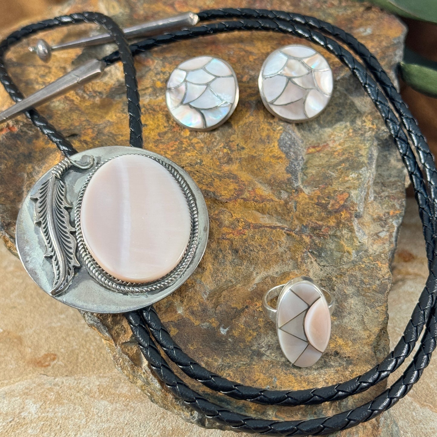 - Style: This bolo tie and matching ring and earrings are beautifully inlaid with Mother of Pearl. The pinkish hue suggests these pieces could be Zuni in origin, known for intricate inlay work. The feather detailing on the bolo tie also hints at Native American craftsmanship, possibly Navajo for the silverwork.