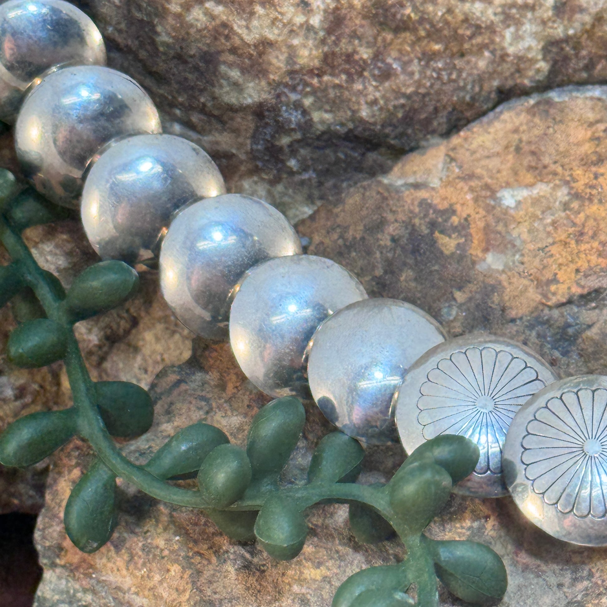 A stunning statement necklace featuring hand-stamped graduated sterling silver domes, often referred to as Navajo pearls with a twist. The design transitions from smaller rounded beads to large domed discs with intricate radial stamps, creating a blend of subtle shine and bold silverwork. Each element is oxidized to enhance texture and contrast, highlighting the artisan detail throughout. A versatile, substantial piece that can stand alone or layer beautifully with other turquoise jewelry.