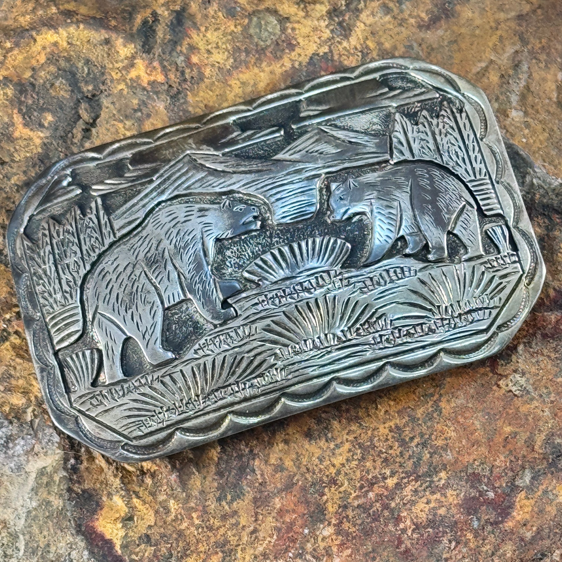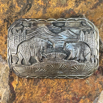 This beautifully crafted silver overlay belt buckle showcases a captivating scene of two bears set against a mountainous landscape, an iconic symbol of strength and connection with nature in Native American culture. Intricately engraved, the buckle embodies the artisan's skill and attention to detail, with delicate overlays and textured elements that bring the scene to life.