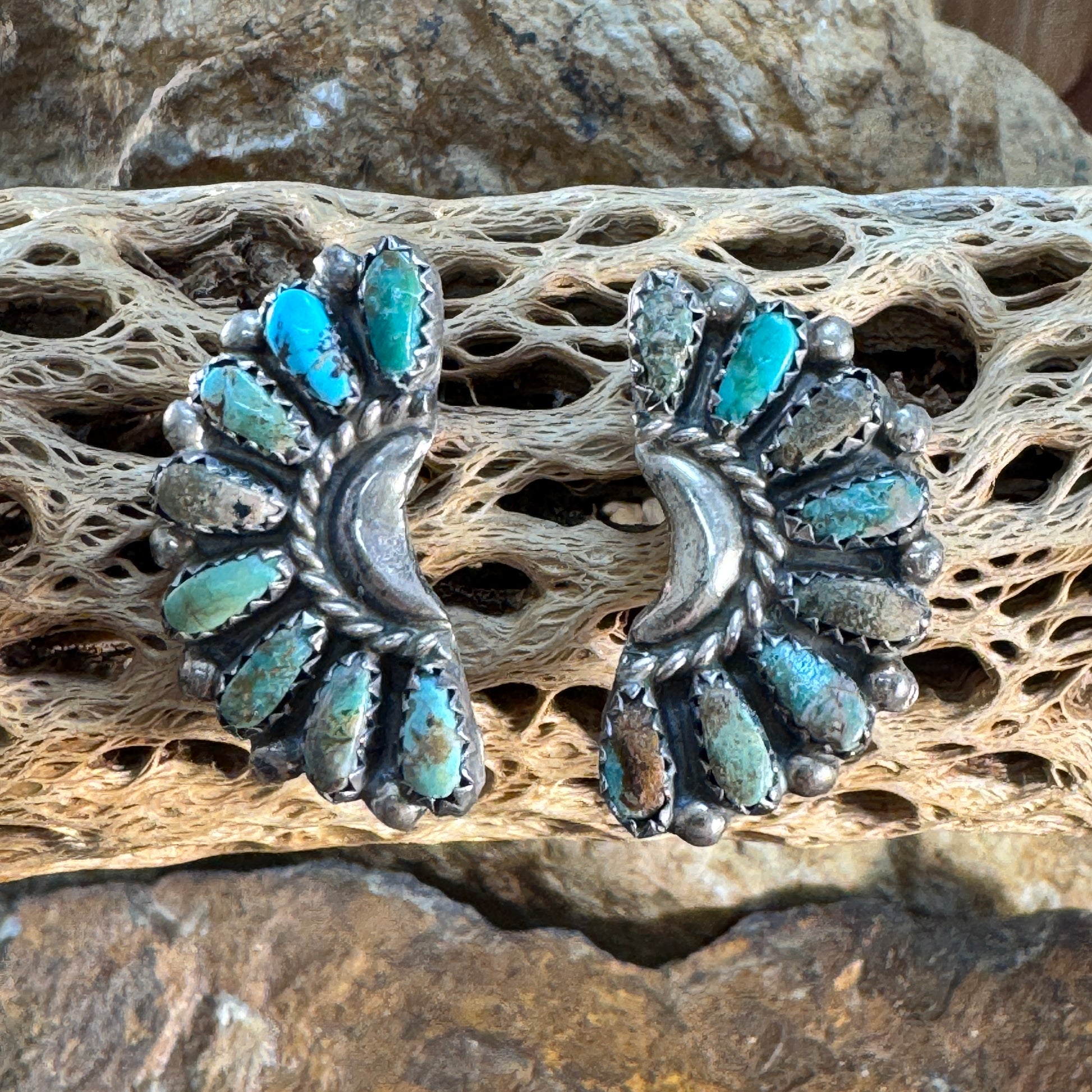 These beautifully aged Zuni turquoise cluster earrings feature natural turquoise stones arranged in a distinctive fan or crescent shape, each individually bezel-set in sterling silver with traditional rope and drop accents. The stones display a rich, varied patina from decades of wear, ranging from sky blue to deep green, indicative of vintage untreated turquoise.
