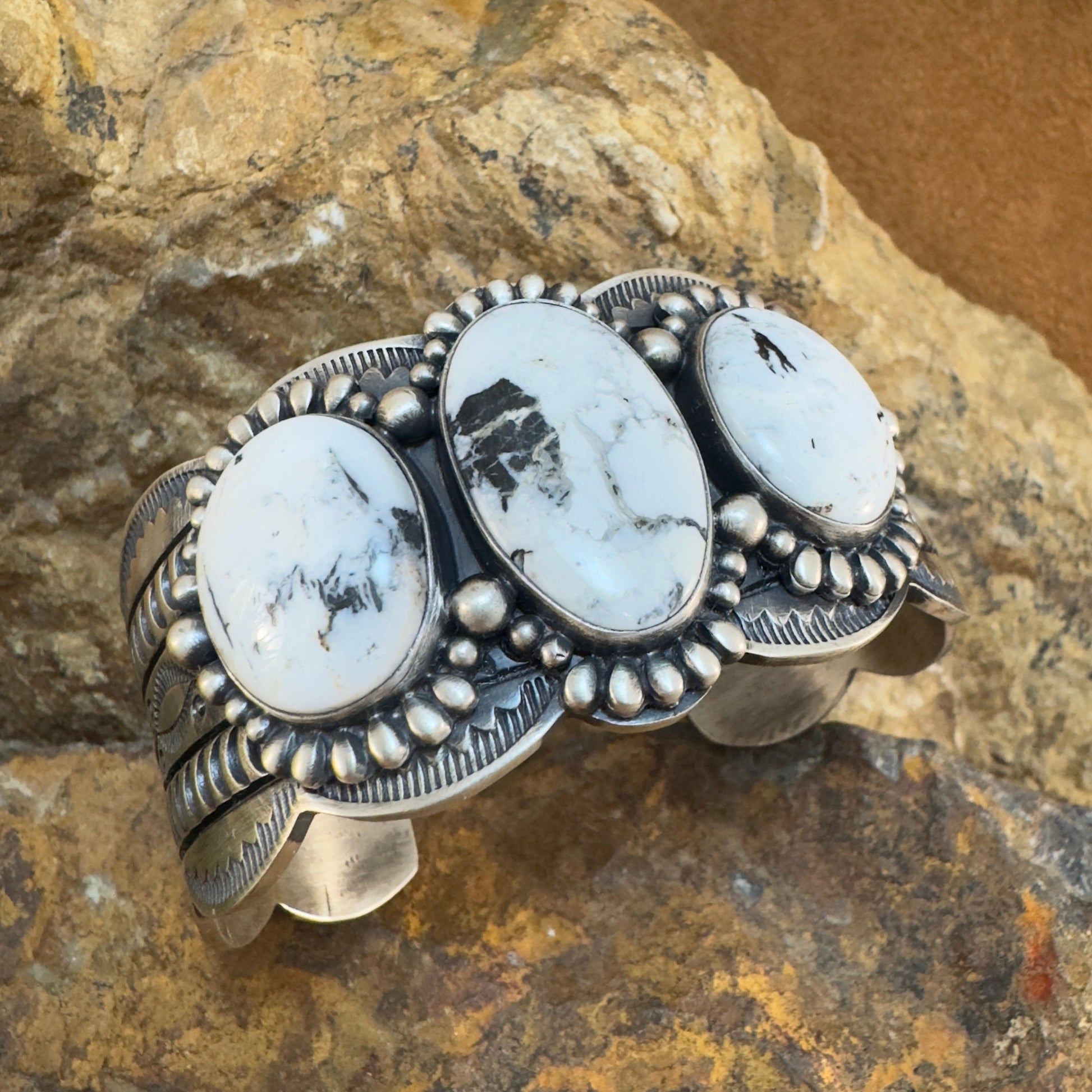 White Buffalo Three-Stone Sterling Silver Cuff Bracelet by Murphy Platero