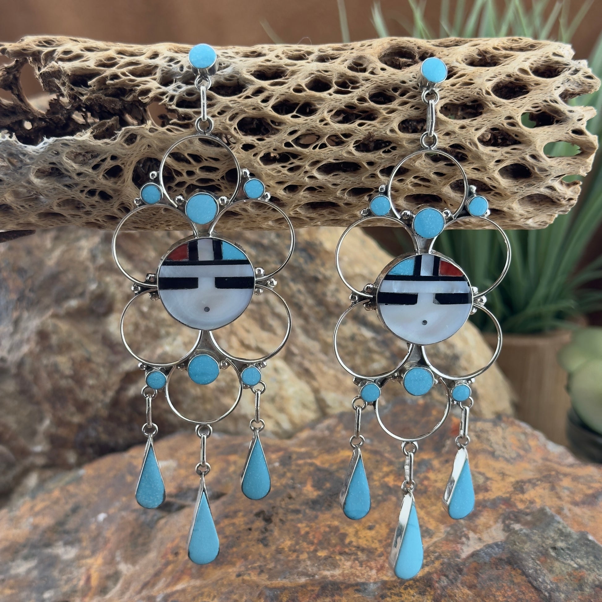 These Zuni Sunface-inspired earrings are a brilliant expression of Native American artistry. Crafted from sterling silver, these earrings feature intricate inlays of turquoise, onyx, coral, and mother of pearl, forming the iconic Sunface motif that symbolizes harmony and balance in Zuni culture. The circular design is complemented by delicate dangling silver teardrops, adding movement and elegance.
